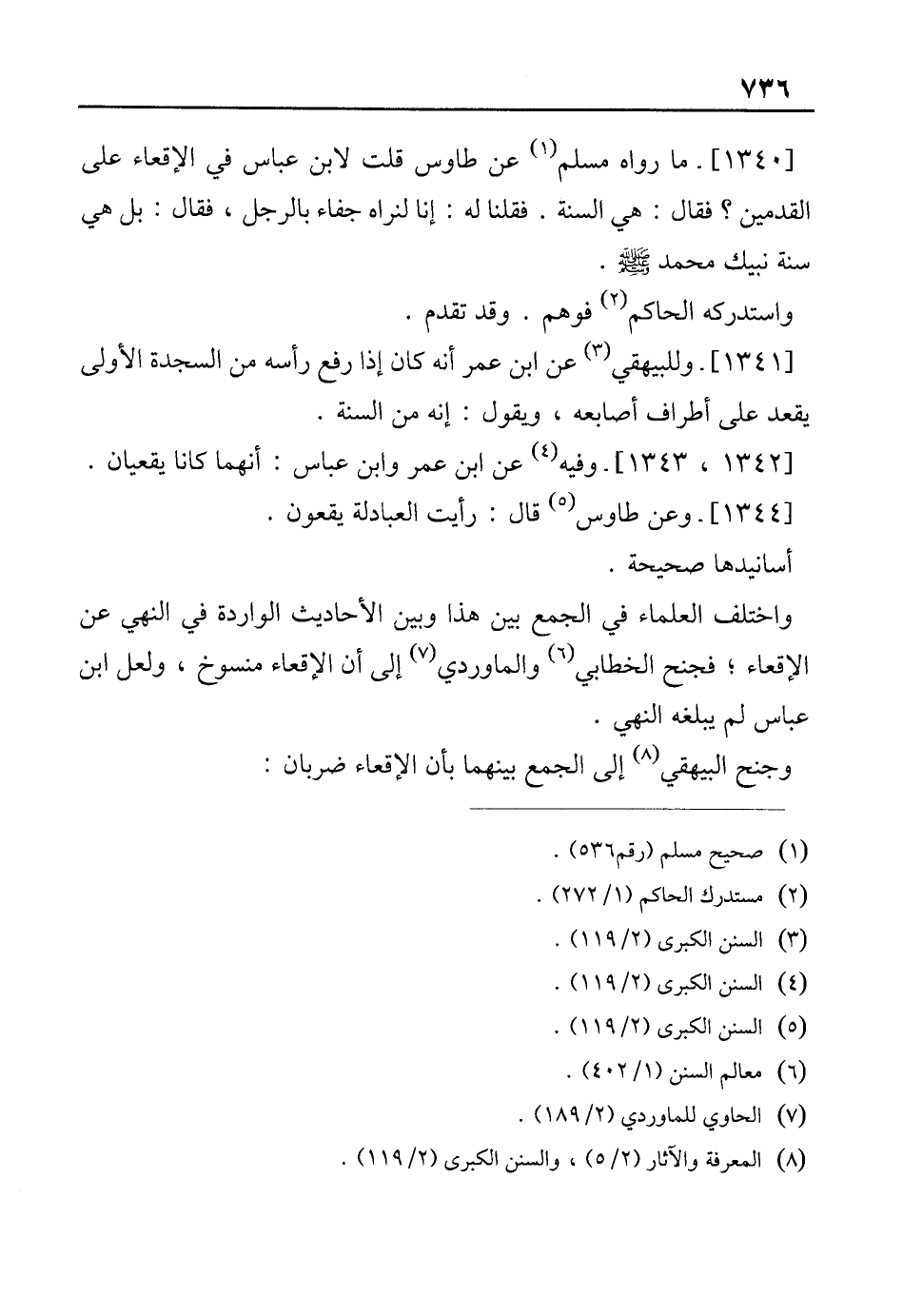 [1340]- ما رواه مسلم (¬1) عن طاولس قلت لابن عباس في الإقعاء على القدمين؟ فقال: هي السنة. فقلنا له: إنا لنراه جفاء بالرجل، فقال: بل هي سنة نبيك محمد - صلى الله عليه وسلم -.