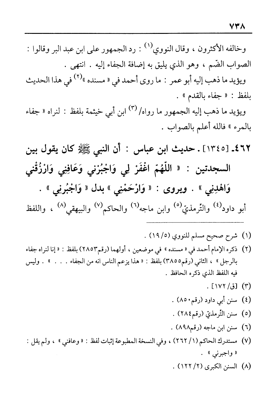 462 - [1345]- حديث ابن عباس: أن النبي - صلى الله عليه وسلم - كان يقول بين السجدتين: "اللهُمّ اغْفَرْ لِي وَاجْبُرْني وَعَافِنِي وَارْزُقْني وَاهْدِنِي". ويروى: "وَارْحَمْنِي" بدل "وَاجْبُرنِي".