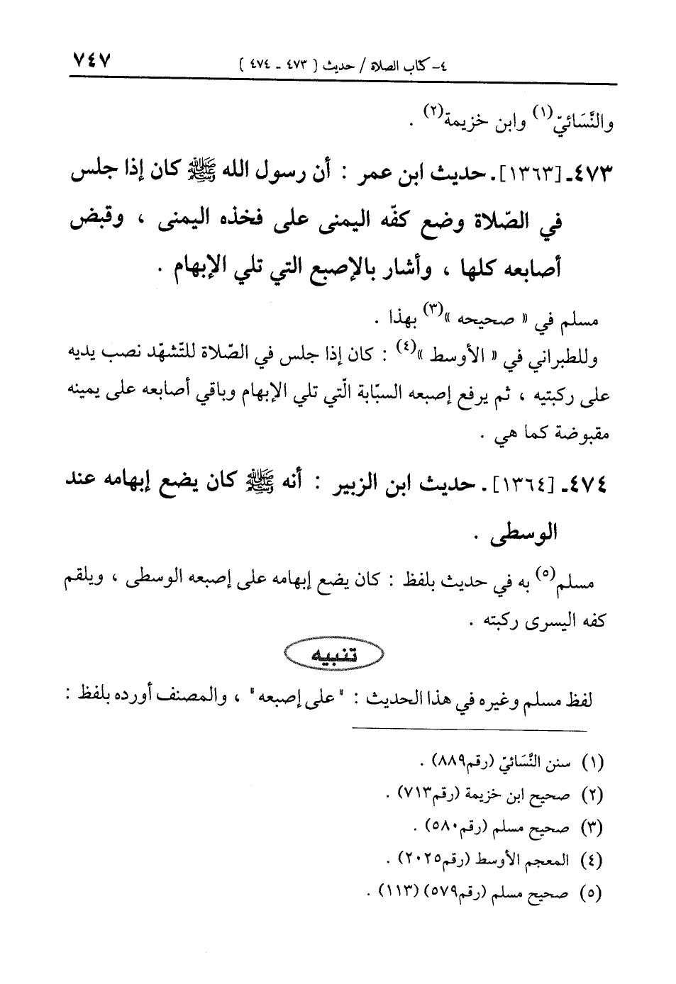 473 - [1363]. حديث ابن عمر: أن رسول الله - صلى الله عليه وسلم - كان إذا جلس في الصّلاة وضع كفّه اليمنى على فخذه اليمنى، وقبض أصابعه كلها، وأشار بالإصبع التي تلي الإبهام.