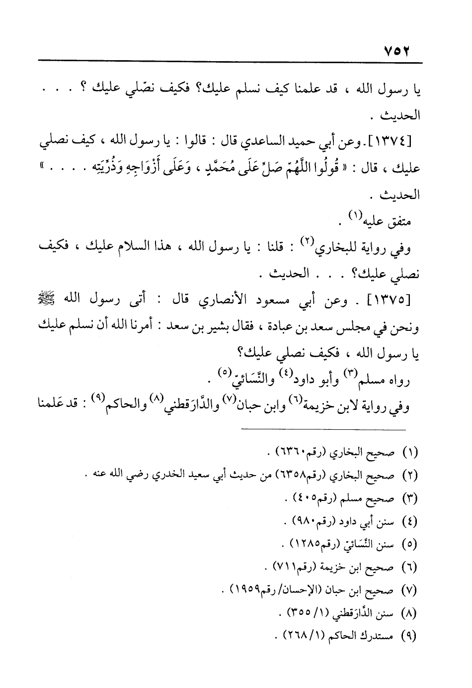 [1375]- وعن أبي مسعود الأنصاري قال: أتى رسول الله - صلى الله عليه وسلم - ونحن في مجلس سعد بن عبادة، فقال بشير بن سعد: أمرنا الله أن نسلم عليك يا رسول الله، فكيف نصلي عليك؟