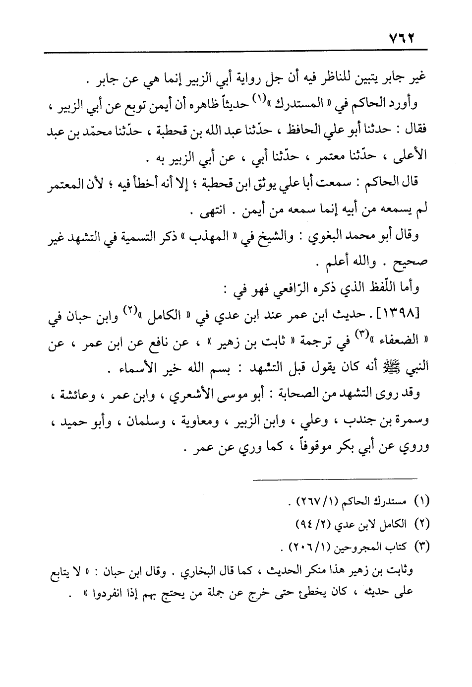 [1398]- حديث ابن عمر عند ابن عدي في "الكامل" (¬2) وابن حبان في "الضعفاء" (¬3) في ترجمة " ثابت بن زهير"، عن نافع عن ابن عمر، عن النبي - صلى الله عليه وسلم - أنه كان يقول قبل التشهد: بسم الله خير الأسماء.