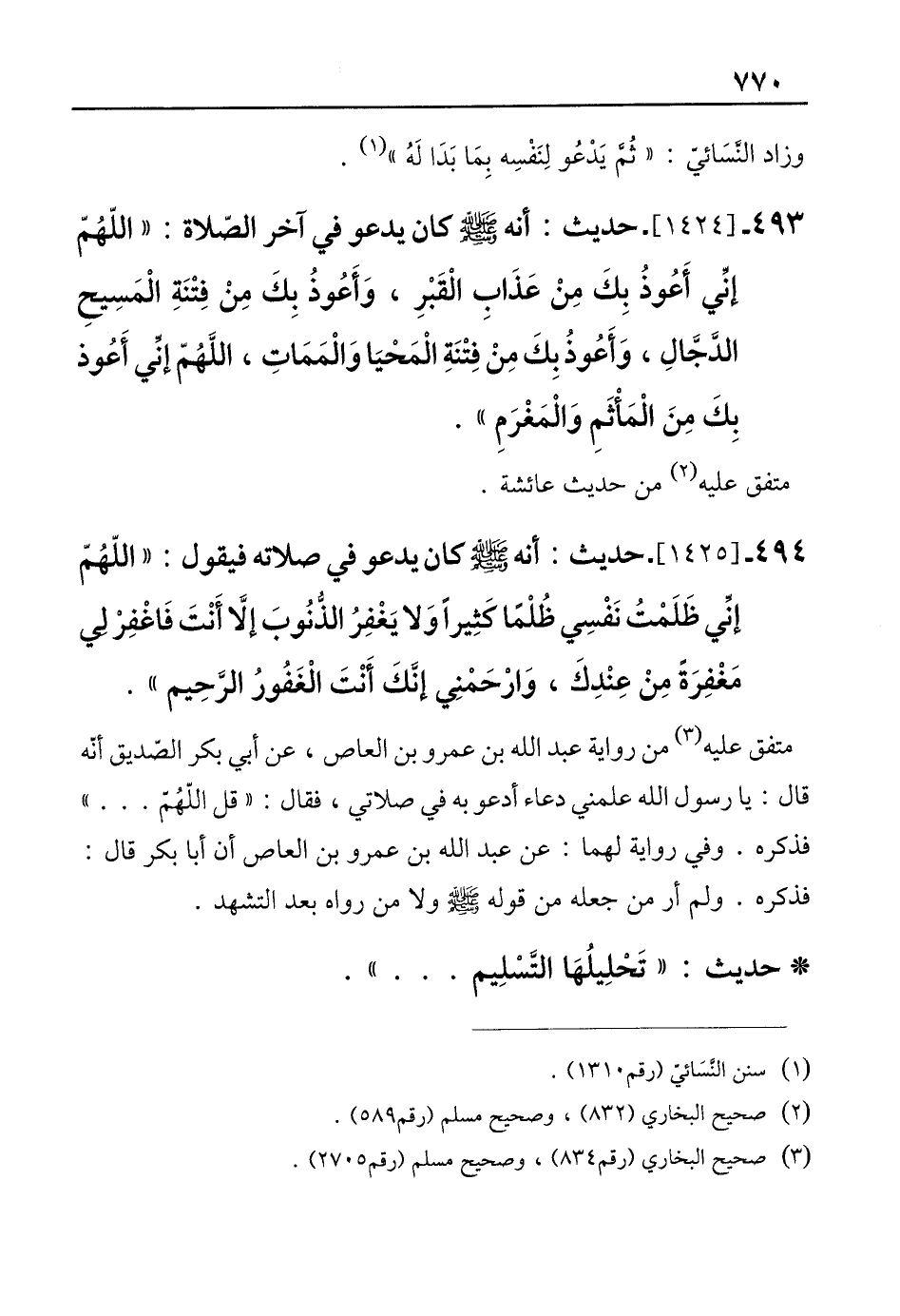 493 - [1424]- حديث: أنه - صلى الله عليه وسلم - كان يدعو في آخر الصّلاة: "اللهُمّ إنِّي أَعُوذُ بِكَ من عَذَابِ الْقَبْرِ، وَأَعُوذُ بِكَ مِنْ فِتْنَةِ الْمَسِيحِ الدَّجَّالِ، وَأَعُوذُ بِكَ مِنْ فِتْنَةِ الْمَحْيَا وَالْمَمَاتِ، اللَّهُمّ إني أَعُوذ بِكَ مِنَ الْمَأْثَمِ وَالْمَغْرَمِ".
