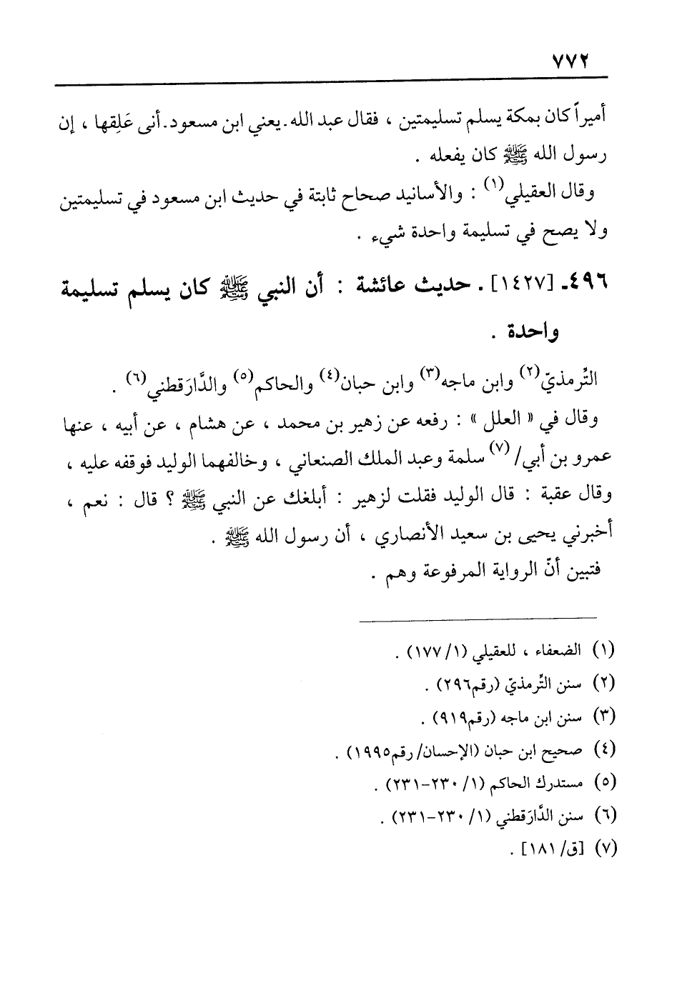 496 - [1427]- حديث عائشة: أن النبي - صلى الله عليه وسلم - كان يسلم تسليمة واحدة.