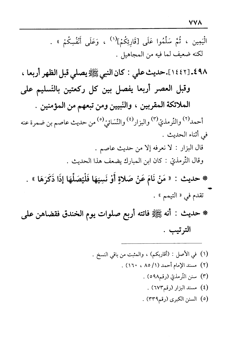 498 - [1442]- حديث علي: كان النبي - صلى الله عليه وسلم - يصلي قبل الظهر أربعًا، وقبل العصر أربعًا يفصل بين كل ركعتين بالتّسليم على الملائكة المقربين، والنّبيين ومن تبعهم من المؤمنين.