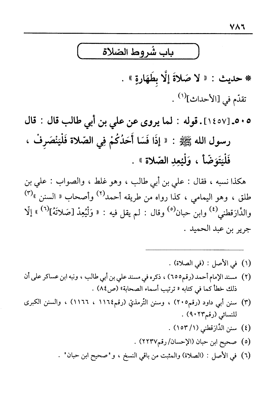 505 - [1457]- قوله: لما يروى عن علي بن أبي طالب قال: قال رسول الله - صلى الله عليه وسلم -: "إذَا فَسَا أَحَدُكُمْ في الصّلاة فلْيَنْصَرِفْ، فَلْيَتَوَضأ، وَلْيُعِدِ الصّلاة".