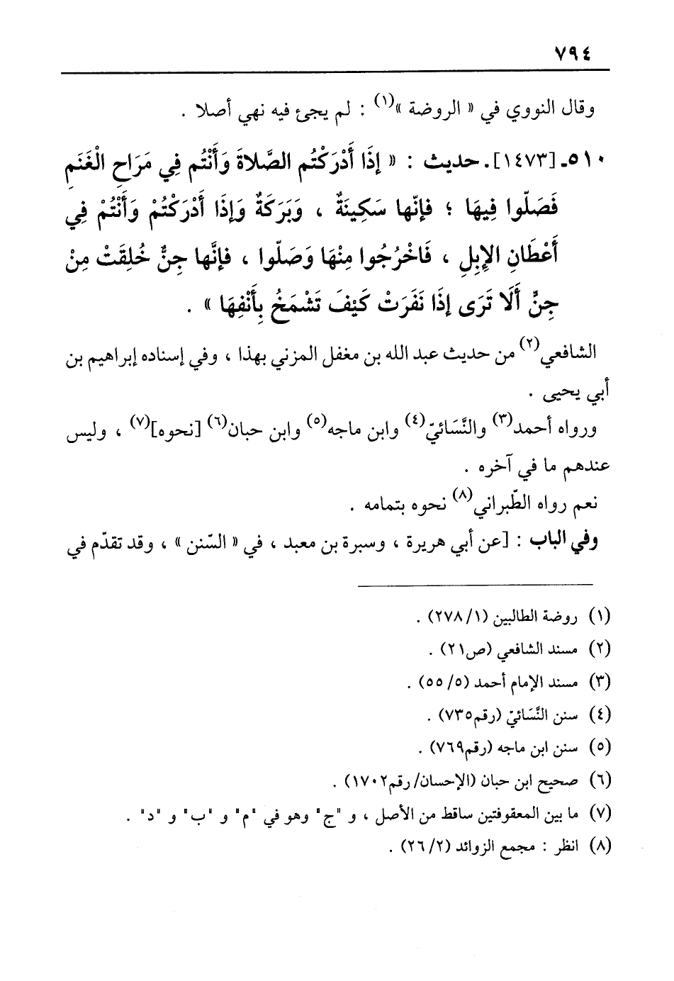 510 - [1473]- حديث: "إذا أَدْرَكتُم الصَلاةَ وَأَنْتُم في مَرَاحِ الْغَنَمِ فَصَلّوا فِيهَا؛ فإنّها سَكِينَةٌ، وَبَرَكَةٌ وَإذَا أَدْرَكتُمْ وَأَنْتُمْ في أَعْطَانِ الإِبِلِ، فَاخْرُجُوا مِنْهَا وَصَلّوا، فإنَّها جِنٌّ خُلِقَتْ مِنْ جِنٍّ أَلَا تَرَى إذَا نَفَرَتْ كيفَ تَشْمَخُ بِأَنْفِهَا".