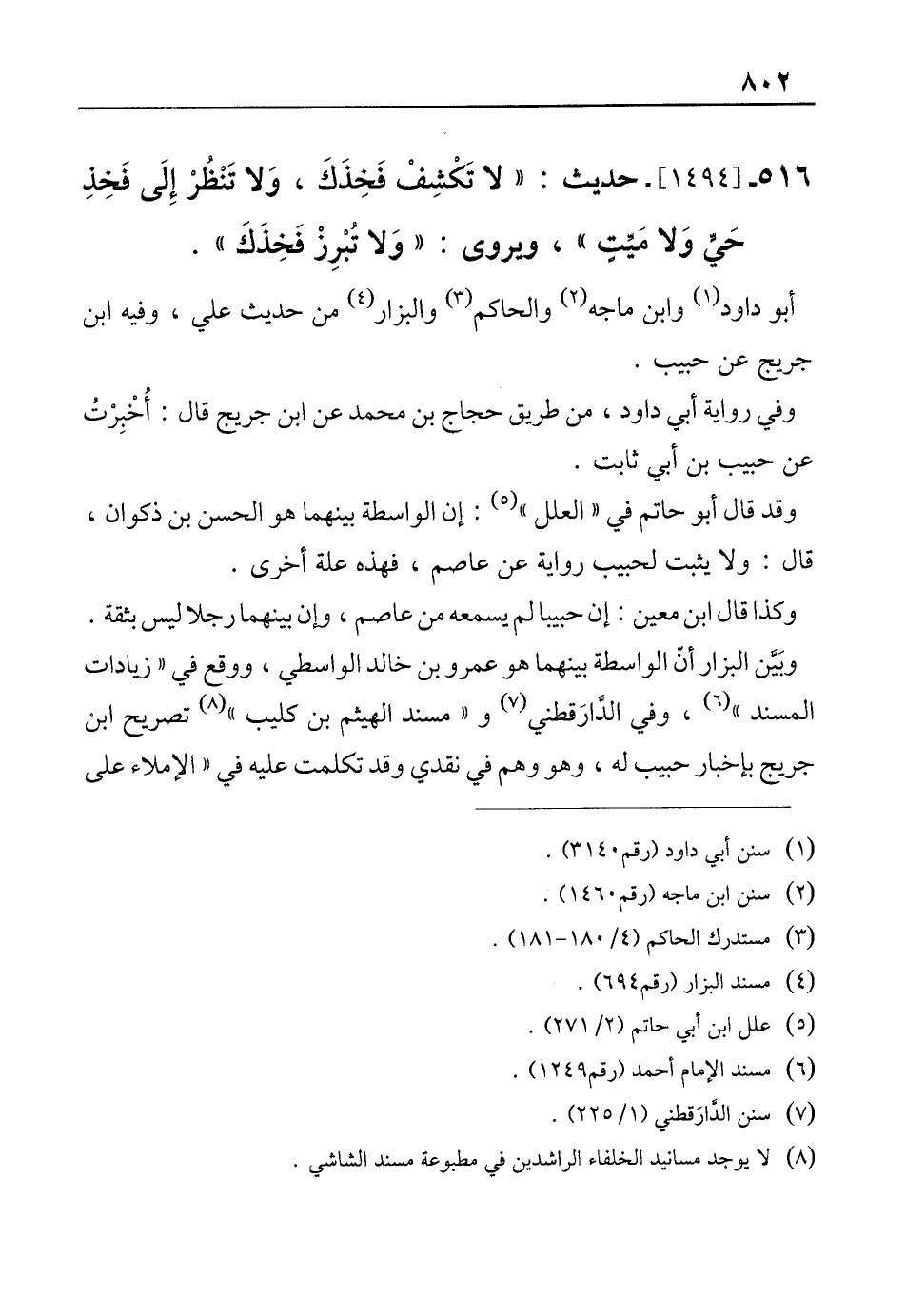 516 - [1494]- حديث: "لا تَكشِف فَخِذَكَ، وَلا تَنْطرْ إِلَى فَخِذِ حَيٍّ وَلا مَيِّتٍ"، ويروى: "وَلا تُبْرِزْ فَخِذَكَ".