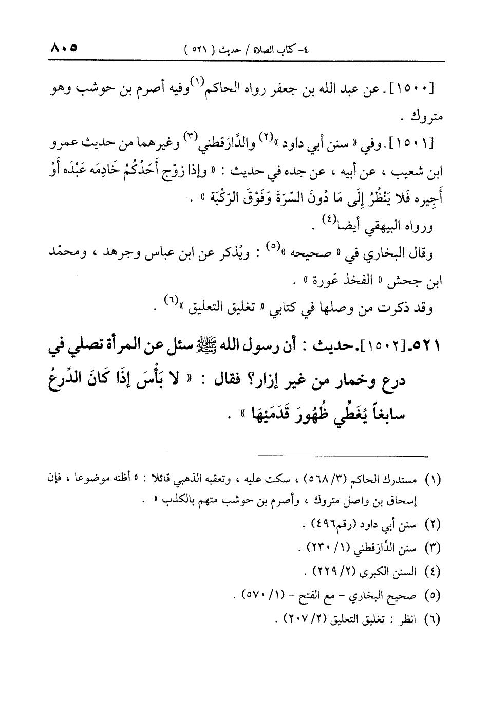 521 - [1502]- حديث: أن رسول الله - صلى الله عليه وسلم - سئل عن المرأة تصلي في درع وخمار من غير إزار؟ فقال: "لا بَأْسَ إذَا كَانَ الدِّرعُ سابغًا يُغَطِّي ظُهورَ قَدَمَيْهَا".