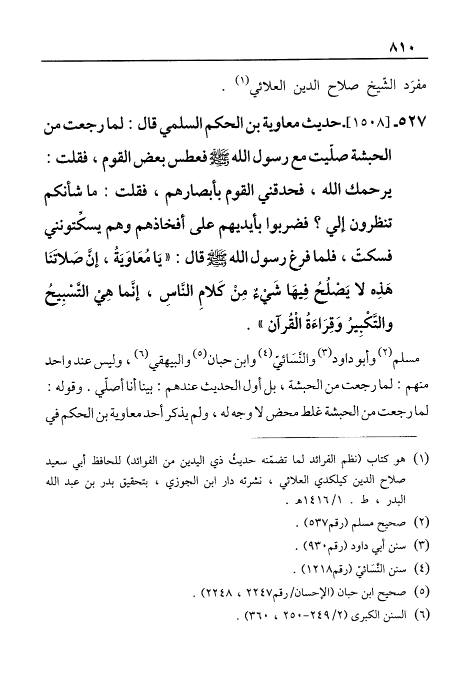 527 - [1508]- حديث معاوية بن الحكم السلمي قال: لما رجعت من الحبشة صلّيت مع رسول الله - صلى الله عليه وسلم - فعطس بعض القوم، فقلت: يرحمك الله، فحدقني القوم بأبصارهم، فقلت: ما شأنكم تنظرون إلي؟ فضربوا بأيديهم على أفخاذهم وهم يسكِّتونني فسكتّ، فلما فرغ رسول الله - صلى الله عليه وسلم - قال: "يَا مُعَاوَيةُ، إنَّ صَلاَتنَا هَذِه لا يَصْلُحُ فِيهَا شَيءٌ مِنْ كَلامِ النَّاسِ، إنَّما هِي التَّسْبِيحُ والتكْبِيرُ وَقِرَاءَةُ الْقُرآن".
