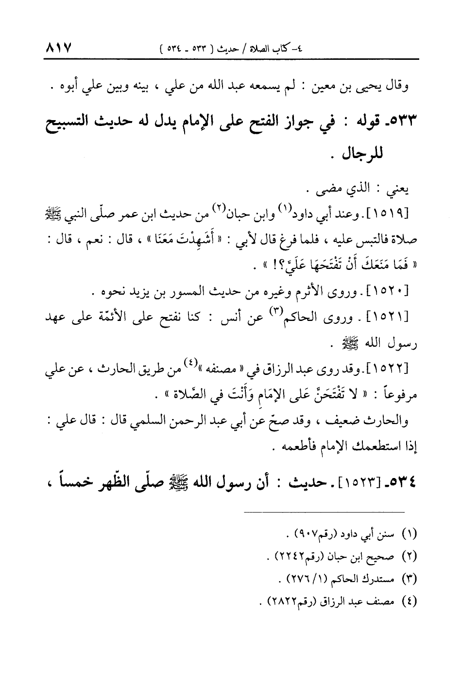 [1522]- وقد روى عبد الرزاق في "مصنفه" (¬4) من طريق الحارث، عن علي مرفوعًا: "لا تَفْتَحَنَّ عَلى الإمَامِ وَأَدتَ في الصَّلاة".