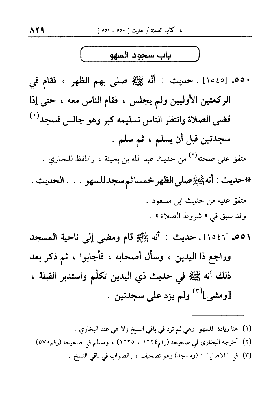 551 - [1546]- حديث: أنه - صلى الله عليه وسلم - قام ومضى إلى ناحية المسجد وراجع ذا اليدين، وسأل أصحابه، فأجابوا، ثم ذكر بعد ذلك أنه - صلى الله عليه وسلم - في حديث ذي اليدين تكلّم واستدبر القبلة، [ومشى] (¬3) ولم يزد على سجدتين.