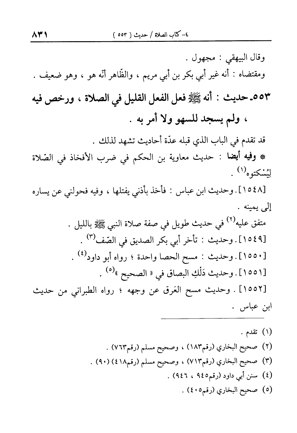 553 - حديث: أنه - صلى الله عليه وسلم - فعل الفعل القليل في الصلاة، ورخص فيه، ولم يسجد للسهو ولا أمر به.