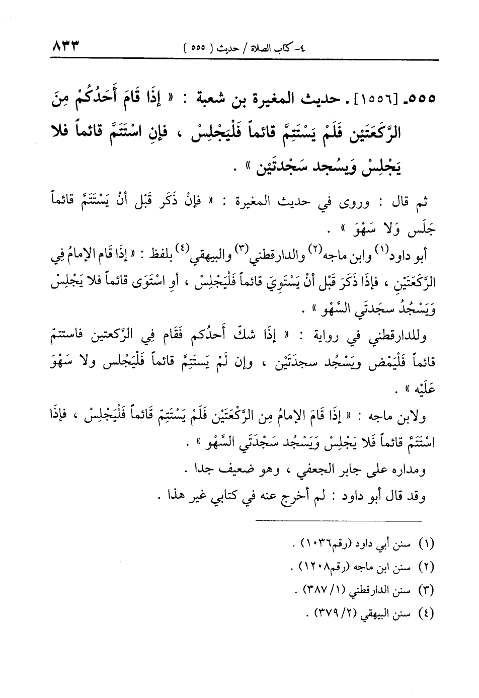 555 - [1556]- حديث المغيرة بن شعبة: "إذَا قَامَ أَحَدُكُمْ مِنَ الرَّكعَتَين فَلَمْ يَسْتَتِمَّ قائمًا فَلْيَجْلِسْ، فإنِ اسْتَتَمَّ قائمًا فلا يَجْلِسْ وَيسُجد سَجْدتَين".