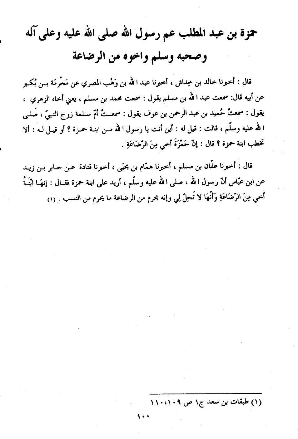 قال: أخبرنا خالد بن خِداش، أخبرنا عبد الله بن وَهْب المصري عن مَخْرمَة بن بُكير عن أبيه قال: سمعت عبد الله بن مسلم يقول: سمعت محمَّد بن مسلم، يعني أخاه الزهري، يقول: سمعتُ حُميد بن عبد الرحمن بن عوف يقول: سمعتُ أمّ سلمة زوج النبيّ، صلى الله عليه وسلّم، قالت: قيل له: أين أنت يا رسول الله من ابنة حمزة؟ أو قيل له: ألا تخطب ابنة حمزة؟ قال: إنّ حَمْزَةَ أخي مِنَ الرّضَاعَةِ.