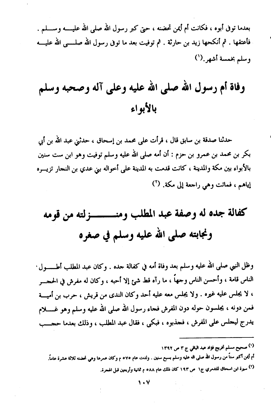 حدثنا صدقة بن سابق قال، قرأت على محمَّد بن إسحاق , حدثني عبد الله بن أبي بكر بن محمَّد بن عمرو بن حزم: أن أمه - صلى الله عليه وسلم - توفيت وهو ابن ست سنين بالأبواء بين مكة والمدينة، كانت قدمت به المدينة على أخواله بني عدي بن النجار تزيره إياهم، فماتت وهي راجعة إلى مكة. (¬2)