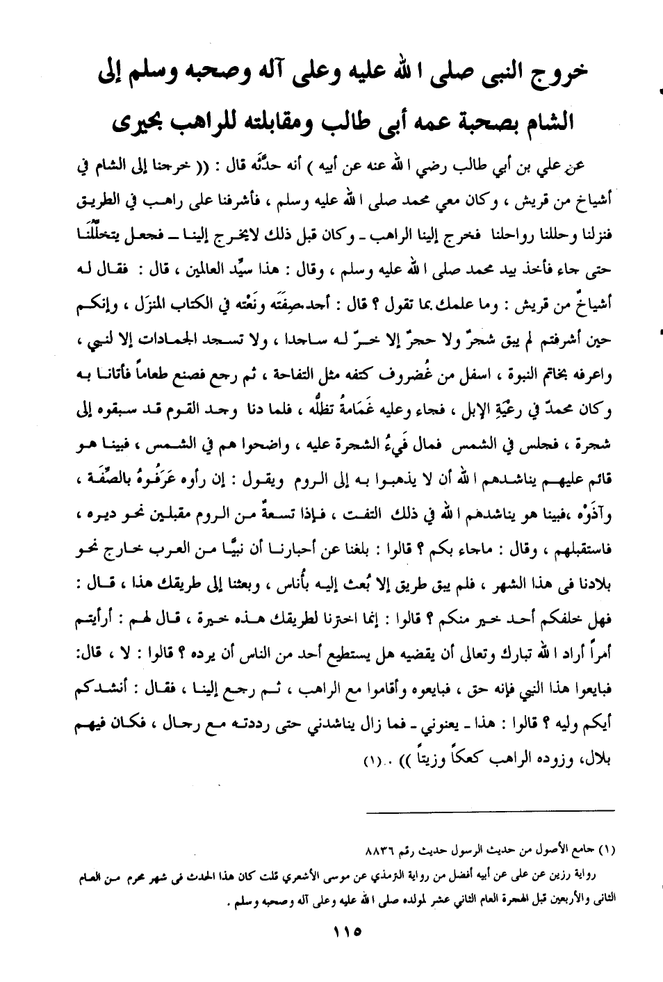 (¬1) جامع الأصول من حديث الرسول حديث رقم 8836، رواية رزين عن على عن أبيه أفضل من رواية الترمذيُّ عن موسى الأشعري قلت كان هذا الحدث في شهر محرم من العام الثاني والأربعين قبل الهجرة العام الثاني عشر لمولده صلى الله عليه وعلى آله وصحبه وسلم.