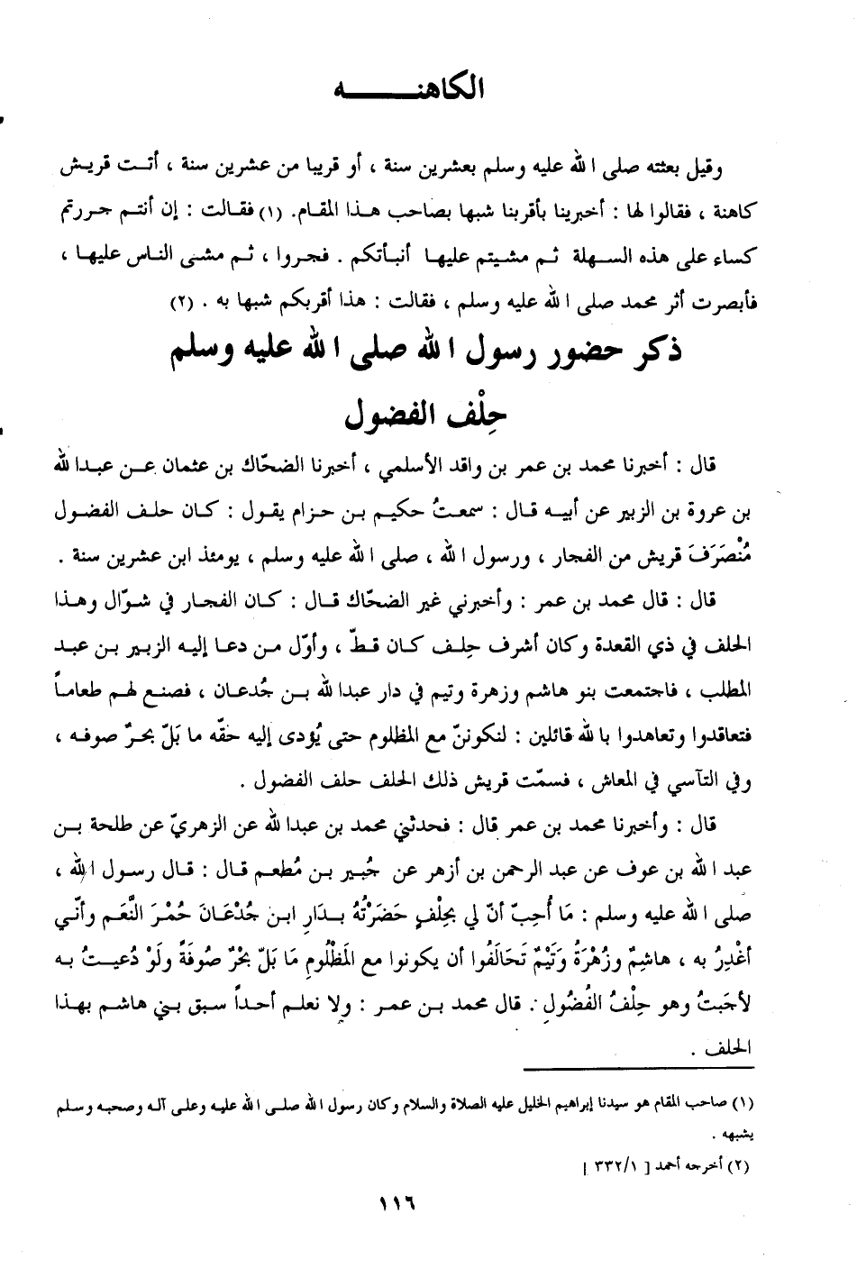 قال: وأخبرنا محمَّد بن عمر قال: فحدثني محمَّد بن عبد الله عن الزهري عن طلحة بن عبد الله بن عوف عن عبد الرحمن بن أزهر عن جُبير بن مُطعم قال: قال رسول الله، - صلى الله عليه وسلم -: مَا أُحِب أنّ لي بحِلفٍ حَضَرْتُهُ بدَارِ ابن جُدْعَانَ حُمْرَ النّعَم وأنّي أغْدِرُ به، هاشِمٌ وزُهْرَةُ وَتَيْمٌ تَحَالَفُوا أن يكونوا مع المَظْلُومِ مَا بَلّ بحْرٌ صُوفَةً ولَوْ دُعيتُ به لأجَبتُ وهو حِلْفُ الفُضُولِ. قال محمَّد بن عمر: ولا نعلم أحدًا سبق بني هاشم بهذا الحلف.