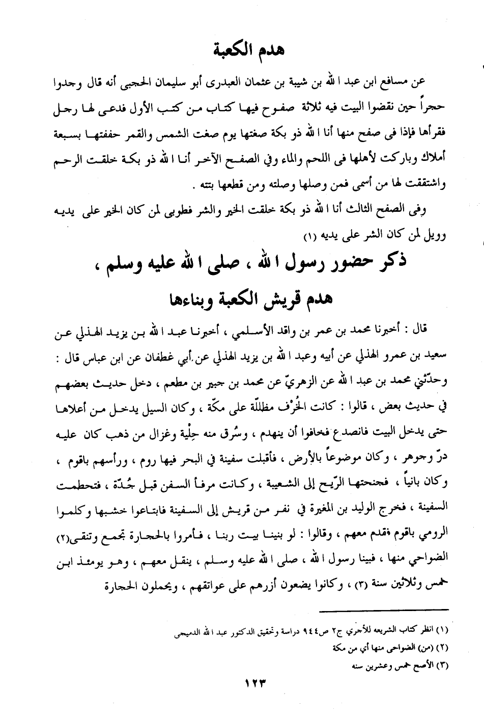 عن مسافع ابن عبد الله بن شيبة بن عثمان العبدري أبو سليمان الحجبي أنه قال وجدوا حجرًا حين نقضوا البيت فيه ثلاثة صفوح فيها كتاب من كتب الأول فدعي لها رجل فقرأها فإذا في صفح منها أنا الله ذو بكة صغتها يوم صغت الشمس والقمر حففتها بسبعة أملاك وباركت لأهلها في اللحم والماء وفي الصفح الآخر أنا الله ذو بكة خلقت الرحم واشتققت لها من أسمي فمن وصلها وصلته ومن قطعها بتته.