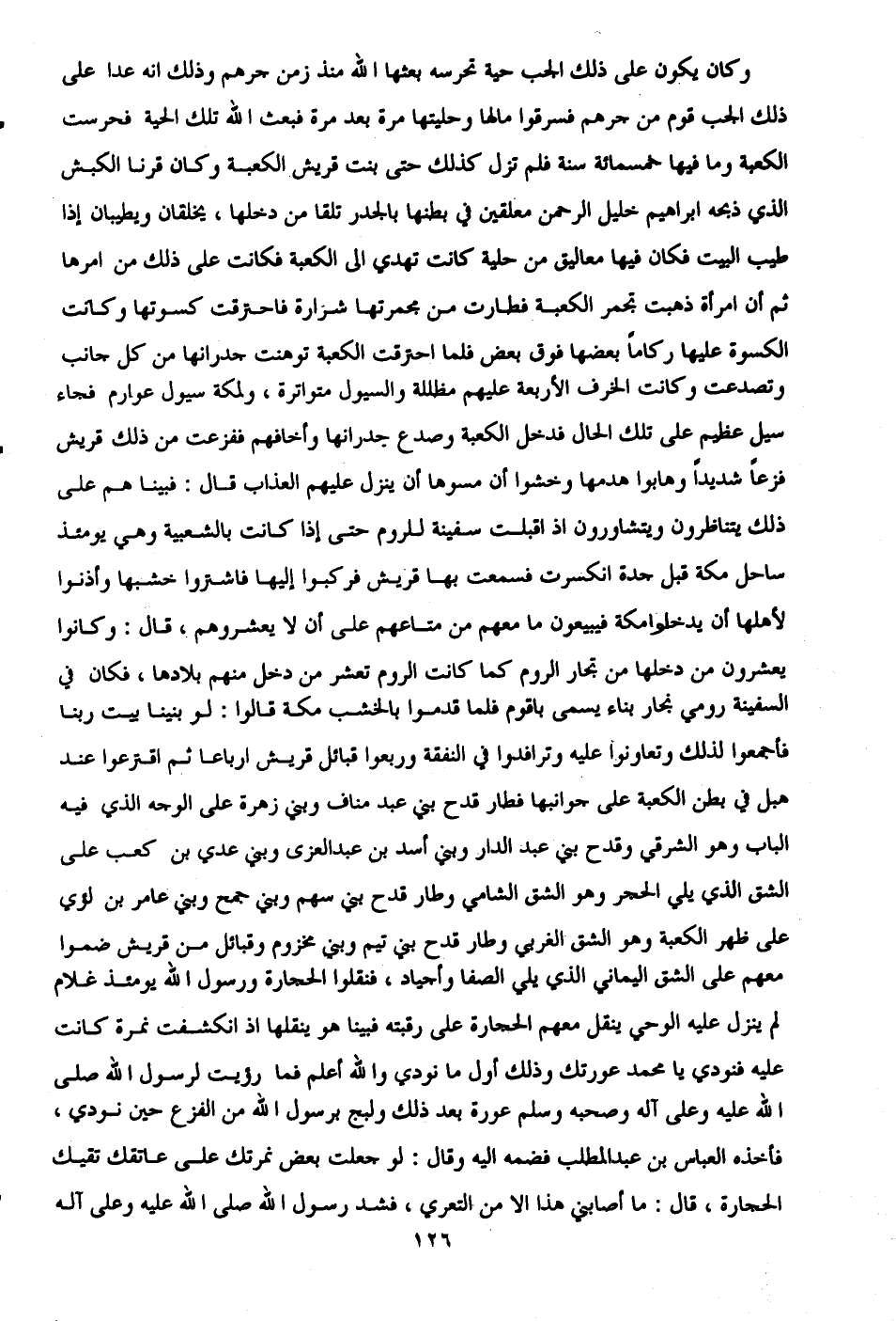 وكان يكون على ذلك الجب حية تحرسه بعثها الله منذ زمن جرهم وذلك إنّه عدا على ذلك الجب قوم من جرهم فسرقوا مالها وحليتها مرة بعد مرة فبعث الله تلك الحية فحرست الكعبة وما فيها خمسمائة سنة فلم تزل كذلك حتى بنت قريش الكعبة وكان قرنا الكبش الذي ذبحه إبراهيم خليل الرحمن معلقين في بطنها بالجدر تلقا من دخلها، يخلقان ويطيبان إذا طيب البيت فكان فيها معاليق من حلية كانت تهدى إلى الكعبة فكانت على ذلك من أمرها ثم أن امرأة ذهبت تجمر الكعبة فطارت من مجمرتها شرارة فأحرقت كسوتها وكانت الكسوة عليها ركامًا بعضها فوق بعض فلما احترقت الكعبة توهنت جدرانها من كل جانب وتصدعت وكانت الخرف الأربعة عليهم مظللة والسيول متواترة، ولمكة سيول عوارم فجاء سيل عظيم على تلك الحال فدخل الكعبة وصدع جدرانها وأخافهم ففزعت من ذلك قريش فزعًا شديدًا وهابوا هدمها وخشوا أن مسوها أن ينزل عليهم العذاب قال: فبينا هم على ذلك يتناظرون ويتشاورون إذ أقبلت سفينة للروم حتى إذا كانت بالشعبية وهي يومئذ ساحل مكة قبل جدة انكسرت فسمعت بها قريش فركبوا إليها فاشتروا خشبها وأذنوا لأهلها أن يدخلوا مكة فيبيعون ما معهم من متاعهم على أن لا يعشروهم، قال: وكانوا يعشرون من دخلها من تجار الروم كما كانت الروم تعشر من دخل منهم بلادها، فكان في السفينة رومي نجار بناء يسمى باقوم فلما قدموا بالخشب مكة قالوا: لو بنينا بيت ربنا فأجمعوا لذلك وتعاونوا عليه وترافدوا في النفقة وربعوا قبائل قريش أرباعًا ثم اقترعوا عند هبل في بطن الكعبة على جوانبها فطار قدح بن عبد مناف وبني زهرة على الوجه الذي فيه الباب وهو الشرقي وقدح بن عبد الدار وبني أسد بن عبد العزى وبني عدي بن كعب على الشق الذي يلي الحجر وهو الشق الشامي وطار قدح بني سهم وبني جمح وبني عامر بن لؤي على ظهر الكعبة وهو الشق الغربي وطار قدح بني تيم وبني مخزوم وقبائل من قريش ضموا معهم على الشق اليماني الذي يلي الصفا وأجياد، فنقلوا الحجارة ورسول الله يومئذ غلام لم ينزل عليه الوحي ينقل معهم الحجارة على رقبته فبينا هو ينقلها إذ انكشفت نمرة كانت عليه فنودي يا محمَّد عورتك وذلك أول ما نودي والله أعلم فما رؤيت لرسول الله صلي الله عليه وعلى آله وصحبه وسلم عورة بعد ذلك ولبج برسول الله من الفزع حين نودي، فأخذه العباس بن عبد المطلب فضمه إليه وقال: لو جعلت بعض نمرتك على عاتقك تقيك الحجارة، قال: ما أصابني هذا إلا من التعري، فشد رسول الله صلى الله عليه وعلى آله