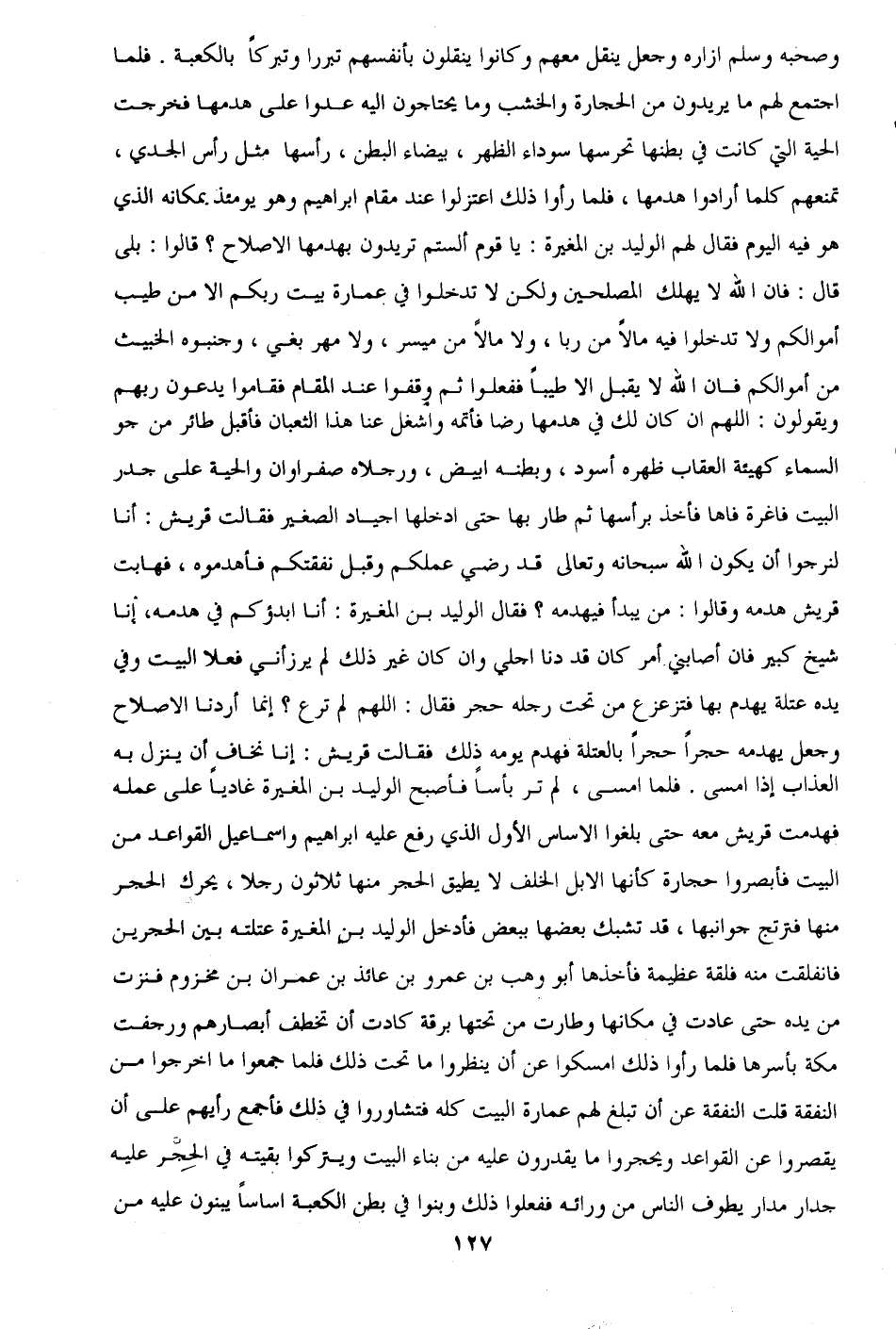 وصحبه وسلم إزاره وجعل ينقل معهم وكانوا ينقلون بأنفسهم تبررا وتبركًا بالكعبة. فلما اجتمع لهم ما يريدون من الحجارة والخشب وما يحتاجون إليه عدوا على هدمها فخرجت الحية التي كانت في بطنها تحرسها سوداء الظهر، بيضاء البطن، رأسها مثل رأس الجدي، تمنعهم كلما أرادوا هدمها، فلما رأوا ذلك اعتزلوا عند مقام إبراهيم وهو يومئذ بمكانه الذي هو فيه اليوم فقال لهم الوليد بن المغيرة: يا قوم ألستم تريدون بهدمها الإصلاح؟ قالوا: بلي قال: فإن الله لا يهلك المصلحين ولكن لا تدخلوا في عمارة بيت ربكم إلا من طيب أموالكم ولا تدخلوا فيه مالًا من ربا , ولا مالًا من ميسر، ولا مهر بغي، وجنبوه الخبيث من أموالكم فإن الله لا يقبل إلا طيبًا ففعلوا ثم وقفوا عند المقام فقاموا يدعون ربهم ويقولون: اللَّهم إن كان لك في هدمها رضًا فأتمه واشغل عنا هذا الثعبان فأقبل طائر من جو السماء كهيئة العقاب ظهره أسود، وبطنه أبيض، ورجلاه صفراوان والحية على جدر البيت فاغرة فاها فأخذ برأسها ثم طار بها حتى أدخلها أجياد الصغير فقالت قريش: انا لنرجوا أن يكون الله سبحانه وتعالي قد رضي عملكم وقبل نفقتكم فاهدموه، فهابت قريش هدمه وقالوا: من يبدأ فيهدمه؟ فقال الوليد بن المغيرة: أنا أبدؤكم في هدمه، أنا شيخ كبير فإن أصابني أمر كان قد دنا أجلي وإن كان غير ذلك لم يرزأني فعلا البيت وفي يده عتلة يهدم بها فتزعزع من تحت رجله حجر فقال: اللَّهم لم ترع؟ إنما أردنا الإصلاح وجعل يهدمه حجرًا حجرًا بالعتلة فهدم يومه ذلك فقالت قريش: إنا نخاف أن ينزل به العذاب إذا أمسى. فلما أمسى، لم تر بأسًا فأصبح الوليد بن المغيرة غاديًا على عمله فهدمت قريش معه حتى بلغوا الأساس الأول الذي رفع عليه إبراهيم وإسماعيل القواعد من البيت فأبصروا حجارة كأنها الإبل الخلف لا يطيق الحجر منها ثلاثون رجلًا، يحرك الحجر منها فترتج جوانبها، قد تشبك بعضها ببعض فأدخل الوليد بن المغيرة عتلته بين الحجرين فانفلقت منه فلقة عظيمة فأخذها أبو وهب بن عمرو بن عائذ بن عمران بن مخزوم فنزت من يده حتى عادت في مكانها وطارت من تحتها برقة كادت أن تخطف أبصارهم ورجفت مكة بأسرها فلما رأوا ذلك امسكوا عن أن ينظروا ما تحت ذلك فلما جمعوا ما اخرجوا من النفقة قلت النفقة عن أن تبلغ لهم عمارة البيت كله فتشاوروا في ذلك فأجمع رأيهم على أن يقصروا عن القواعد ويحجروا ما يقدرون عليه من بناء البيت ويتركوا بقيته في الحِجْر عليه جدار مدار يطوف الناس من ورائه ففعلوا ذلك وبنوا في بطن الكعبة أساسًا يبنون عليه من