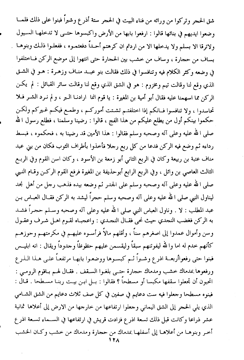 شق الحجر وتركوا من ورائه من فناء البيت في الحجر ستة أذرع وشبرًا فبنوا على ذلك فلما وضعوا أيديهم في بنائها قالوا: ارفعوا بابها من الأرض واكبسوها حتى لا تدخلها السيول ولا ترقا إلا بسلم ولا يدخلها إلا من أردتم إن كرهتم أحدًا دفعتموه، ففعلوا ذلك وبنوها بساف من حجارة، وساق من خشب بين الحجارة حتى انتهوا إلى موضع الركن فاختلفوا في وضعه وكثر الكلام فيه وتنافسوا في ذلك فقالت بنو عبد مناف وزهرة: هو في الشق الذي وقع لنا وقالت تيم ومخزوم: هو في الشق الذي وقع لنا وقالت سائر القبائل: لم يكن الركن مما أسهمنا عليه فقال أبو أمية بن المغيرة: يا قوم إنما أردنا البر، ولم نرد الشر فلا تحاسدوا , ولا تنافسوا فإنكم إذا اختلفتم تشتت أموركم، وطمع فيكم غيركم ولكن حكموا بينكم أول من يطلع عليكم من هذا الفج، قالوا: رضينا وسلمنا، فطلع رسول الله صلى الله عليه وعلى آله وصحبه وسلم فقالوا: هذا الأمين قد رضينا به، فحكموه، فبسط رداءه ثم وضع فيه الركن فدعا من كل ربع رجلًا فأخذوا بأطراف الثوب فكان من بني عبد مناف عتبة بن ربيعة وكان في الربع الثاني أبو زمعة بن الأسود، وكان أسن القوم وفي الربع الثالث العاصي بن وائل، وفي الربع الرابع أبو حذيفة بن المغيرة فرفع القوم الركن وقام النبي صلى الله عليه وعلى آله وصحبه وسلم على الجدر ثم وضعه بيده فذهب رجل من أهل نجد ليناول النبي صلى الله عليه وعلى آله وصحبه وسلم حجرًا ليشد به الركن فقال العباس بن عبد المطلب: لا. وناول العباس النبي صلى الله عليه وعلى آله وصحبه وسلم حجرًا فشد به الركن فغضب النجدي حيث نحي فقال النجدي: واعجباه لقوم أهل شرف وعقول وسن وأموال عمدوا إلى أصغرهم سنًا، وأقلهم مالًا فرأسوه عليهم في مكرمتهم وحوزهم كأنهم خدم له أما والله ليفوتنهم سبقًا وليقسمن عليهم حظوظًا وجدودًا ويقال: إنّه إبليس فبنوا حتى رفعوا أربعة أذرع وشبرًا ثم كبسوها ووضعوا بابها مرتفعًا على هذا الذرع ورفعوها بمدماك خشب ومدماك حجارة حتى بلغوا السقف. فقال لهم باقوم الرومي: أتحبون أن تجعلوا سقفها مكبسا أو مسطحًا؟ فقالوا: بل ابن بيت ربنا مسطحا. قال: فبنوه مسطحا وجعلوا فيه ست دعايم في صفين في كل صف ثلاث دعايم من الشق الشامي الذي يلي الحجر إلى الشق اليماني وجعلوا ارتفاعها من خارجها من الأرض إلى أعلاها ثمانية عشر ذراعا وكانت قبل ذلك تسعة أذرع فزادت قريش في ارتفاعها في السماء تسعة أذرع أخر وبنوها من أعلاها إلى أسفلها بمدماك من حجارة ومدماك من خشب وكان الخشب