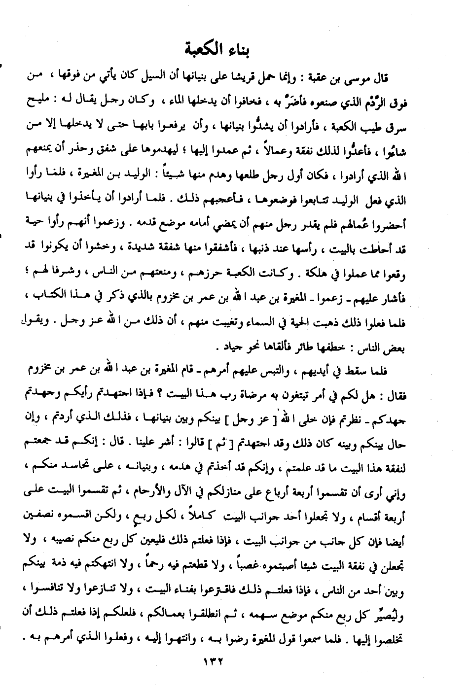 فلما سقط في أيديهم، والتبس عليهم أمرهم -قام المغيرة بن عبد الله بن عمر بن مخزوم فقال: هل لكم في أمر تبتغون به مرضاة رب هذا البيت؟ فإذا اجتهدتم رأيكم وجهدتم جهدكم- نظرتم فإن خلى الله [-عَزَّ وجَلَّ-] بينكم وبين بنيانها، فذلك الذي أردتم، وإن حال بينكم وبينه كان ذلك وقد اجتهدتم [ثم] قالوا: أشر علينا. قال: إنكم قد جمعتم لنفقة هذا البيت ما قد علمتم، وإنكم قد أخذتم في هدمه، وبنيانه، على تحاسد منكم، وإني أرى أن تقسموا أربعة أرباع على منازلكم في الآل والأرحام، ثم تقسموا البيت على أربعة أقسام، ولا تجعلوا أحد جوانب البيت كاملًا، لكل ربعٍ، ولكن اقسموه نصفين أيضًا فإن كل جانب من جوانب البيت، فإذا فعلتم ذلك فليعين كل ربع منكم نصيبه، ولا تجعلن في نفقة البيت شيئًا أصبتموه غصبًا، ولا قطعتم فيه رحمًا، ولا انتهكتم فيه ذمة بينكم وبين أحد من الناس، فإذا فعلتم ذلك فاقترعوا بفناء البيت، ولا تنازعوا ولا تنافسوا، وليُصيِّر كل ربع منكم موضع سهمه، ثم انطقوا بعمالكم، فلعلكم إذا فعلتم ذلك أن تخلصوا إليها. فلما سمعوا قول المغيرة رضوا به، وانتهوا إليه، وفعلوا الذي أمرهم به.