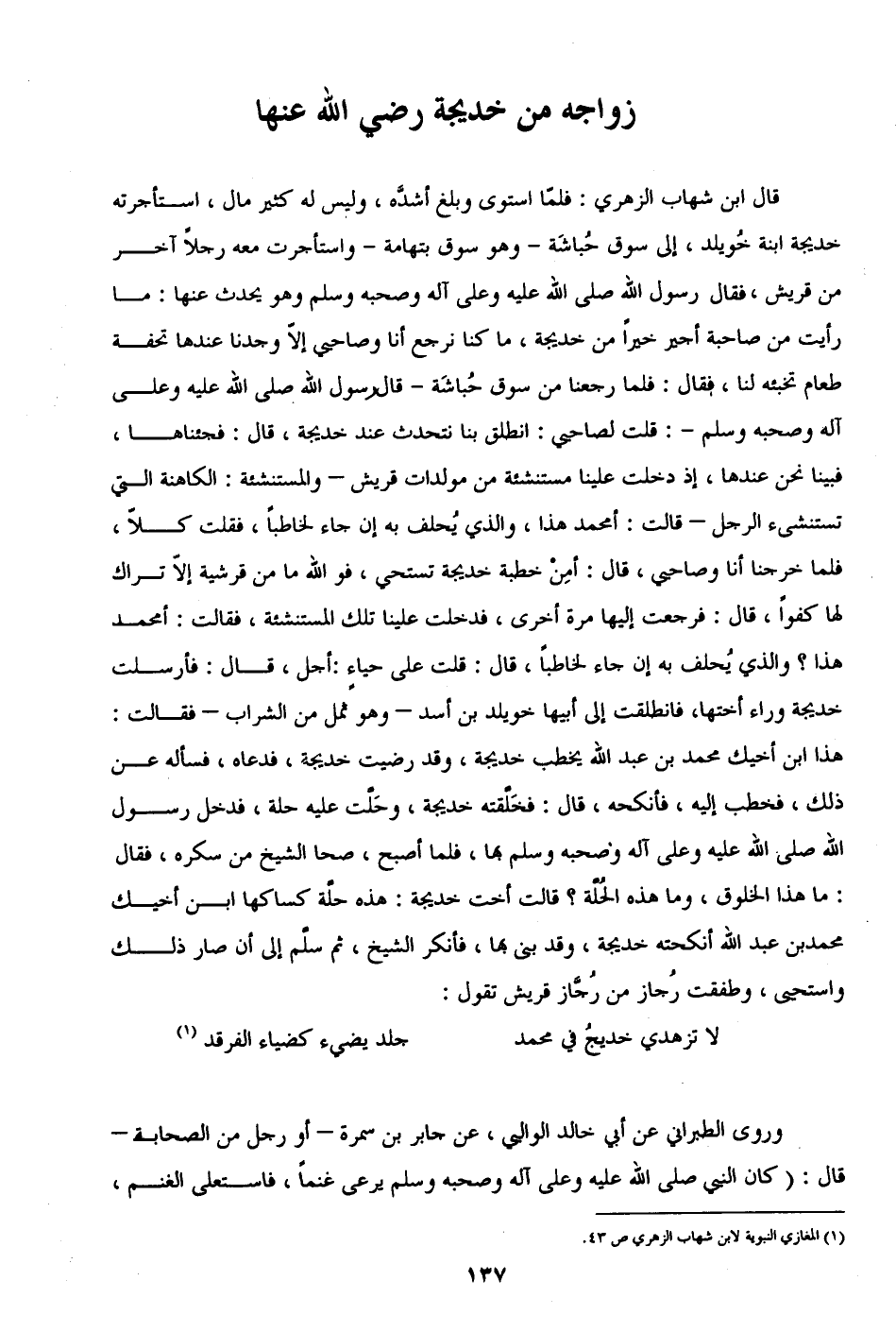 قال ابن شهاب الزهري: فلمّا استوى وبلغ أشدَّه، وليس له كثير مال، استأجرته خديجة ابنة خُويلد، إلى سوق حُباشَة -وهو سوق بتهامة- واستأجرت معه رجلًا آخر من قريش، فقال رسول الله صلى الله عليه وعلى آله وصحبه وسلم وهو يحدث عنها: ما رأيت من صاحبة أجير خيرًا من خديجة، ما كنا نرجع أنا وصاحبي إلَّا وجدنا عندها تحفة طعام تخبئه لنا، فقال: فلما رجعنا من سوق حُباشَة -قال رسول الله صلى الله عليه وعلى آله وصحبه وسلم-: قلت لصاحبي: انطلق بنا نتحدث عند خديجة، قال: فجئناها، فبينا نحن عندها، إذ دخل علينا مستنشئة من مولدات قريش -والمستنشئة: الكاهنة التي تستنشيء الرجل- قالت: أمحمد هذا، والذي يُحلف به إن جاء لخاطبًا، فقلت كلَّا، فلما خرجنا أنا وصاحبي، قال: أمِنْ خطبة خديجة تستحي، فوالله ما من قرشية إلَّا تراك لها كفوًا، قال: فرجعت إليها مرة أخرى، فدخلت علينا تلك المستنشئة، فقالت: أمحمد هذا؟ والذي يُحلف به إن جاء لخاطبًا، قال: قلت على حياء: أجل، قال: فأرسلت خديجة وراء أختها، فانطلقت إلى أبيها خويلد بن أسد -وهو ثمل من الشراب- فقالت: هذا ابن أخيك محمَّد بن عبد الله يخطب خديجة، وقد رضيت خديجة، فدعاه، فسأله عن ذلك، فخطب إليه، فأنكحه، قال: فخَلَّقته خديجة، وحَلَّت عليه حلة، فدخل رسول الله صلى الله عليه وعلى آله وصحبه وسلم بها، فلما أصبح، صحا الشيخ من سكره، فقال: ما هذا الخلوق، وما هذه الحُلَّة؟ قالت أخت خديجة: هذه حلَّة كساكها ابن أخيك محمد بن عبد الله أنكحته خديجة، وقد بنى بها، فأنكر الشيخ، ثم سلَّم إلى أن صار ذلك واستحيي، وطفقت رُجاز من رُجَّاز قريش تقول: