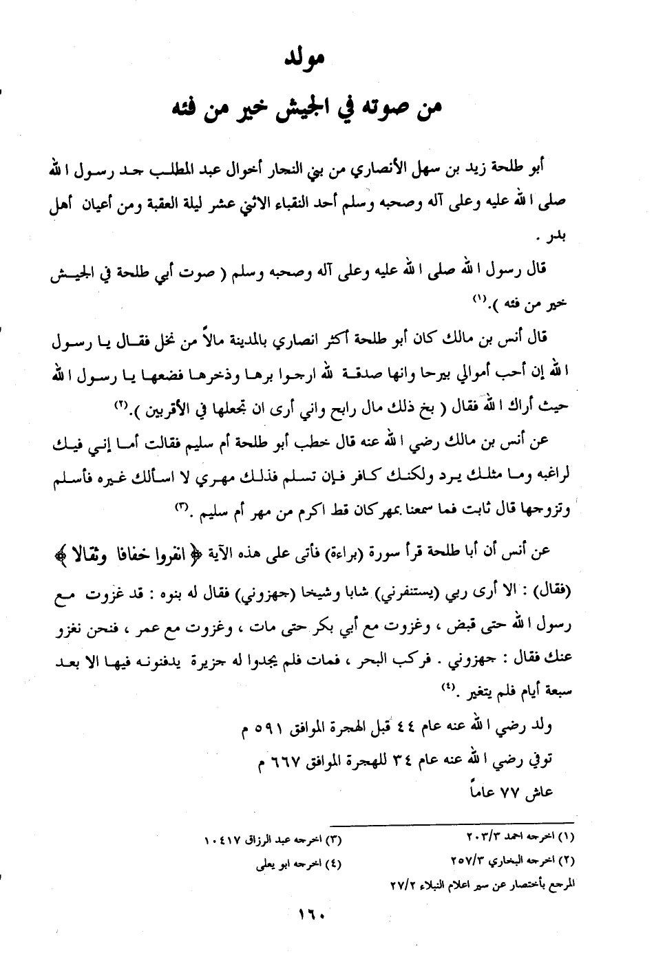 قال رسول الله صلى الله عليه وعلى آله وصحبه وسلم (صوت أبي طلحة في الجيش خير من فئة). (¬1)