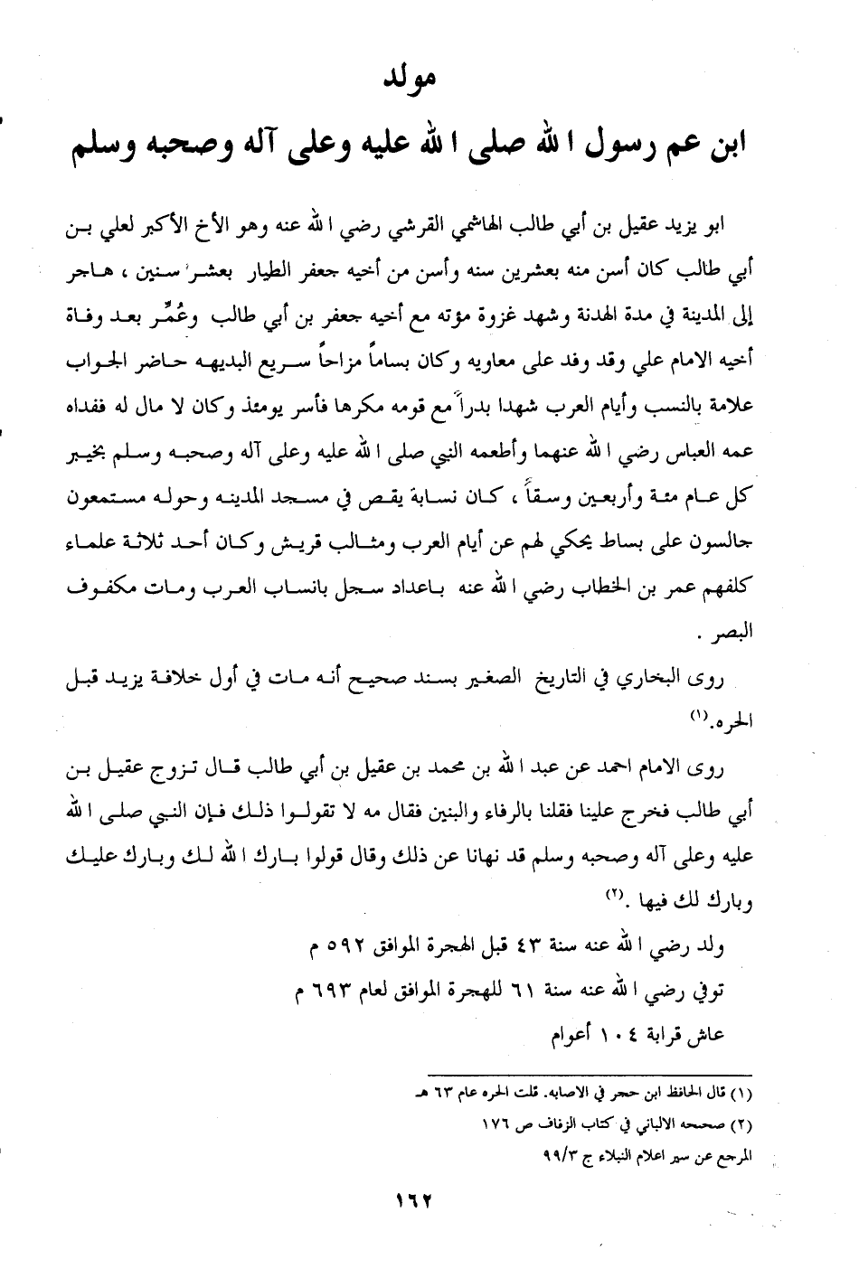أبو يزيد عقيل بن أبى طالب الهاشمي القرشي -رضي الله عنه- وهو الأخ الأكبر لعلي بن أبي طالب كان أسن منه بعشرين سنه وأسن من أخيه جعفر الطيار بعشر سنين، هاجر إلى المدينة في مدة الهدنة وشهد غزوة مؤته مع أخيه جعفر بن أبى طالب وعُمِّر بعد وفاة أخيه الإمام علي وقد وفد على معاوية وكان بسامًا مزاحًا سريع البديهة حاضر الجواب علامة بالنسب وأيام العرب شهد بدرًا مع قومه مكرها فأسر يومئذ وكان لا مال له ففداه عمه العباس -رضي الله عنهما- وأطعمه النبي صلى الله عليه وعلى آله وصحبه وسلم بخيبر كل عام مئة وأربعين وسقًا، كان نسابة يقص في مسجد المدينة وحوله مستمعون جالسون على بساط يحكي لهم عن أيام العرب ومثالب قريش وكان أحد ثلاثة علماء كلفهم عمر بن الخطاب -رضي الله عنه- بإعداد سجل بأنساب العرب ومات مكفوف البصر.