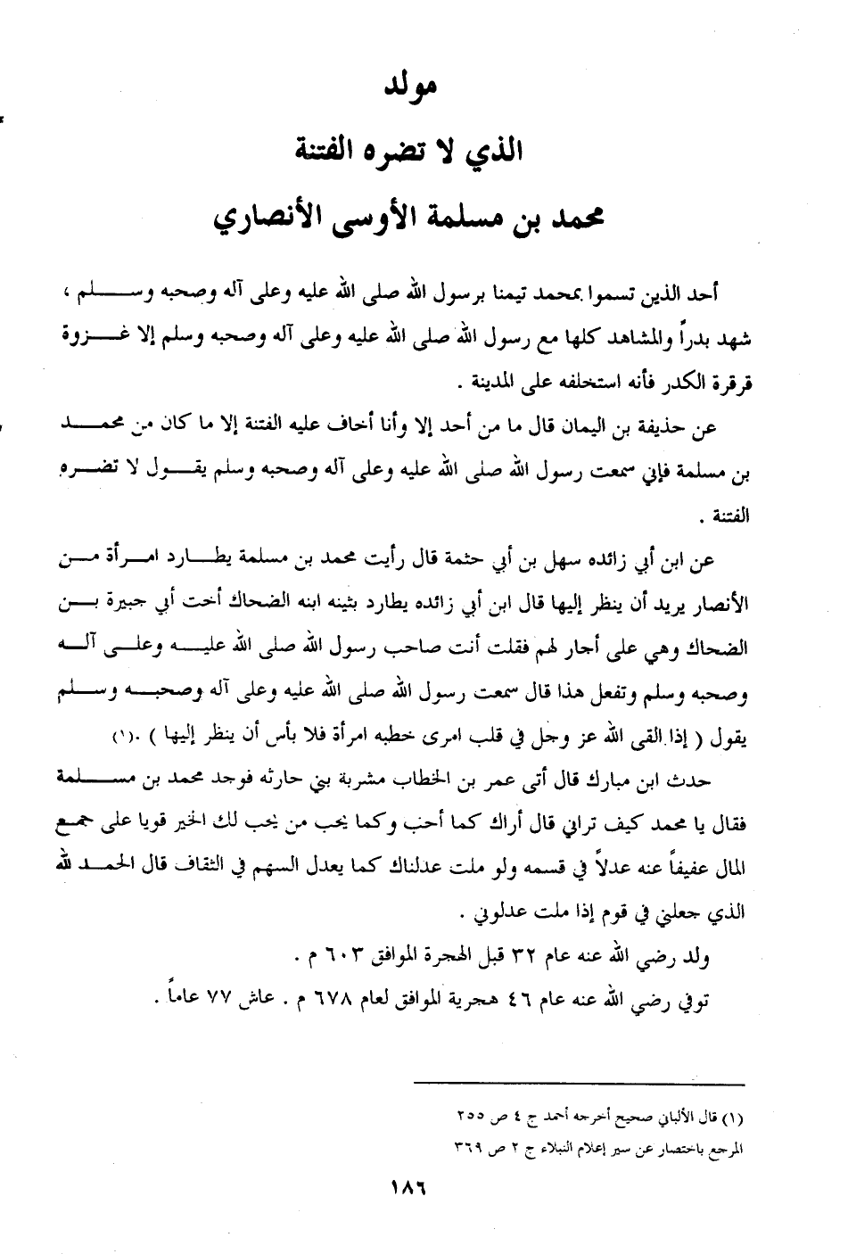 عن حذيفة بن اليمان قال ما من أحد إلا وأنا أخاف عليه الفتنة إلا ما كان من محمَّد بن مسلمة فإني سمعت رسول الله صلى الله عليه وعلى آله صحبه وسلم يقول لا تضره الفتنة.