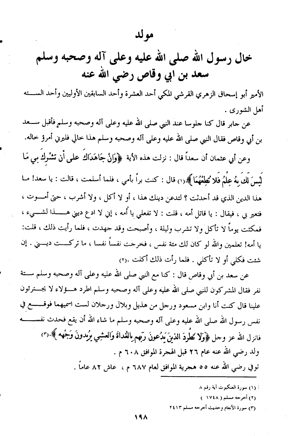 عن سعد بن أبي وقاص قال: كنا مع النبي صلى الله عليه وعلى آله وصحبه وسلم ستة نفر فقال المشركون للنبي صلى الله عليه وعلى آله وصحبه وسلم اطرد هؤلاء لا يجترئون علينا قال كنت أنا وابن مسعود ورجل من هذيل وبلال ورجلان لست أسميهما فوقع في نفس رسول الله صلى الله عليه وعلى آله وصحبه وسلم ما شاء الله أن يقع فحدث نفسه فأنزل الله -عَزَّ وَجَلَّ- {وَلَا تَطْرُدِ الَّذِينَ يَدْعُونَ رَبَّهُمْ بِالْغَدَاةِ وَالْعَشِيِّ يُرِيدُونَ وَجْهَهُ}. (¬3)