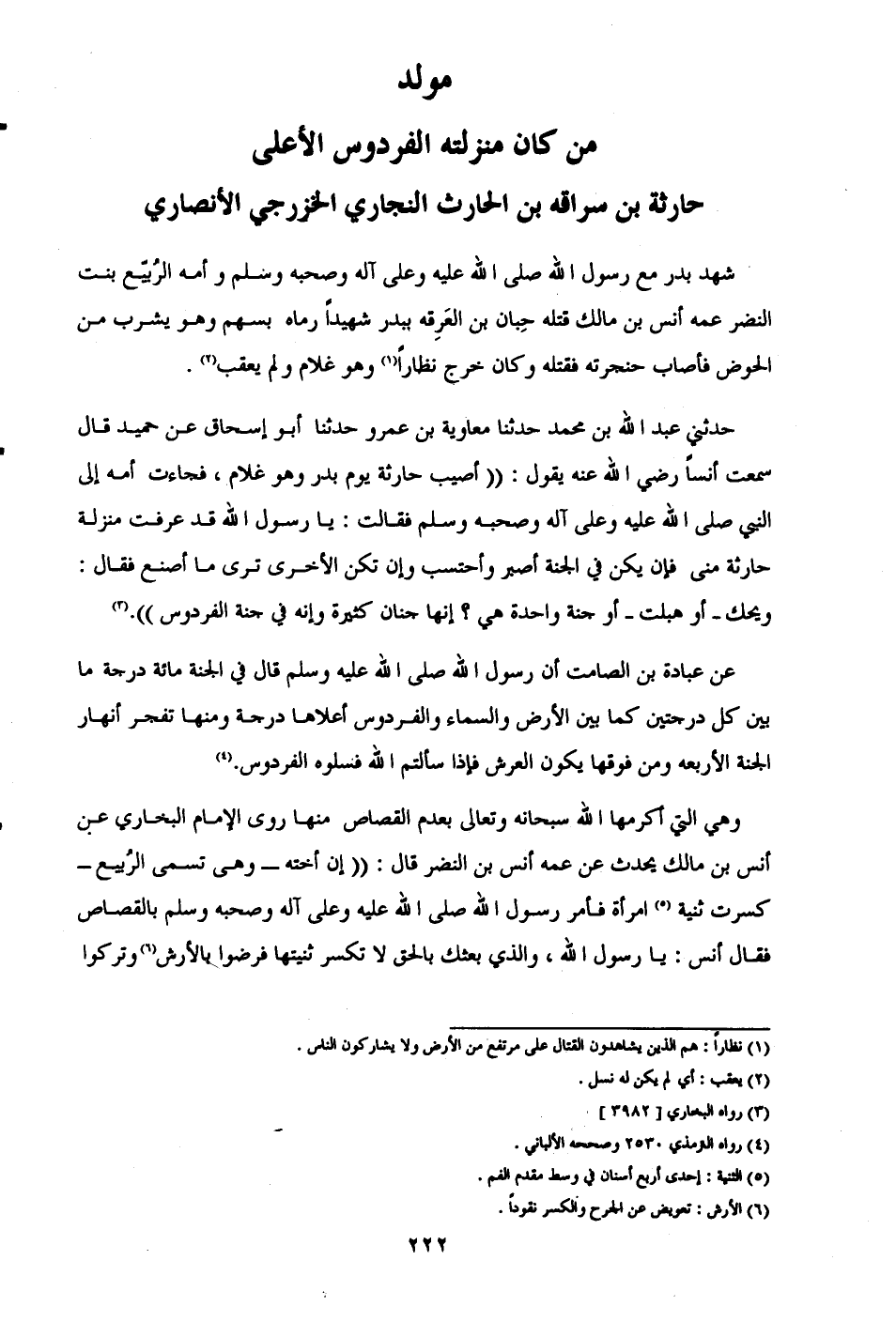 مولد من كان منزلته الفردوس الأعلى حارثة بن سراقه بن الحارث النجاري الخزرجي الأنصاري