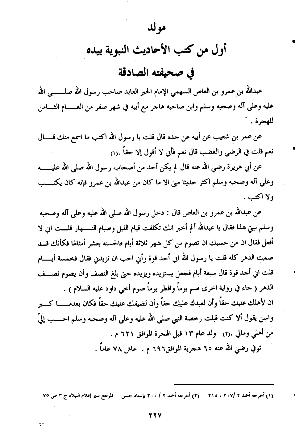 إن لأهلك عليك حقًا وإن لعبدك عليك حقًا وإن لضيفك عليك حقًا فكان بعدما كبر وأسن يقول ألا كنت قبلت رخصة النبي صلى الله عليه وعلى آله وصحبه وسلم أحب إليّ من أهلي ومالي. (¬2) ولد عام 13 قبل الهجرة الموافق 621 م.