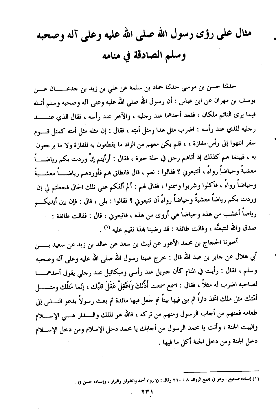 حدثنا حسن بن موسى حدثنا حماد بن سلمة عن علي بن زيد بن جدعان عن يوسف بن مهران عن ابن عباس: أن رسول الله صلى الله عليه وعلى آله وصحبه وسلم أتاه فيما يرى النائم ملكان، فقعد أحدهما عند رجليه، والآخر عند رأسه، فقال الذي عند رجليه للذي عند رأسه: اضرب مثل هذا ومثل أمتِه، فقال: إن مثله ومثل أمته كمثل قوم سفر انتهوا إلى رأس مفازة، فلم يكن معهم من الزاد ما يقطعون به المفازة ولا ما يرجعون به، فبينما هم كذلك إذ أتاهم رجل في حلة حبرة، فقال: أرأيتم إن وردت بكم رياضًا معشبةً وحياضًا رواءً، أتتبعوني؟ فقالوا: نعم، قال فانطلق بهم فأوردهم رياضًا معشبةً وحياضًا رواءً، فأكلوا وشربوا وسمنوا، فقال لهم: ألم ألقكم على تلك الحال فجعلتم لي إن وردت بكم رياضًا معشبةً وحياضًا رواءً أن تتبعوني؟ فقالوا: بلى، قال: فإن بين أيديكم رياضًا أعشب من هذه وحياضًا هي أروى من هذه، فاتبعوني، قال: فقالت طائفة: صدق والله لنتبعنَّه، وقالت طائفة: قد رضينا بهذا نقيم عليه (¬1).