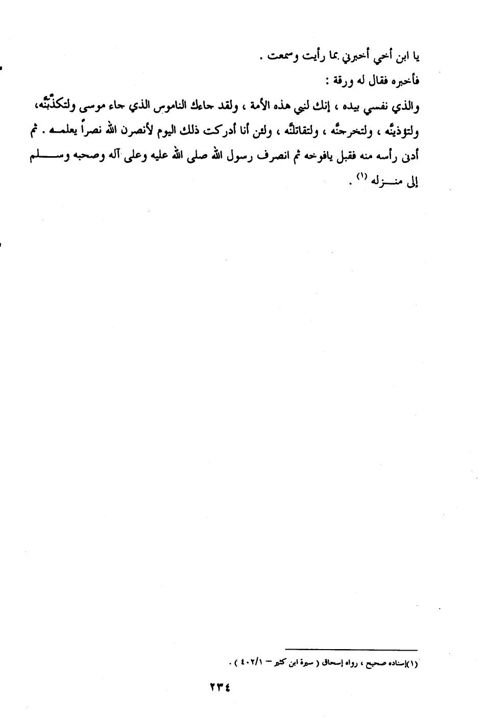 والذي نفسي بيده، إنك لنبي هذه الأمة، ولقد جاءك الناموس الذي جاء موسى ولتكذَّبَنَّه، ولتؤذينَّه، ولتخرجنَّه، ولتقاتلنَّه، ولئن أنا أدركت ذلك اليوم لأنصرن الله نصرًا يعلمه. ثم أدنى رأسه منه فقبل يافوخه ثم انصرف رسول الله صلى الله عليه وعلى آله وصحبه وسلم إلى منزله (¬1).