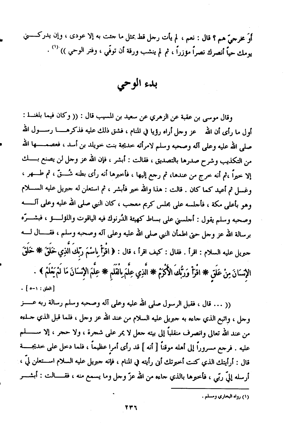 وقال موسى بن عقبة عن الزهريّ عن سعيد بن المسيب قال: "وكان فيما بلغنا: أول ما رأى أن الله -عَزَّ وَجَلَّ- أراه رؤيا في المنام، فشق ذلك عليه فذكرها رسول الله صلى الله عليه وعلى آله وصحبه وسلم لامرأته خديجة بنت خويلد بن أسد، فعصمها الله من التكذيب وشرح صدرها بالتصديق، فقالت: أبشر، فإن الله -عَزَّ وَجَلَّ- لن يصنع بك إلا خيرًا، ثم أنه خرج من عندها، ثم رجع إليها، فأخبرها أنه رأى بطنه شُقّ، ثم طهر، وغسل ثم أعيد كما كان. قالت: هذا والله خير فأبشر، ثم استعلن له جبريل -عليه السلام- وهو بأعلى مكة، فأجلسه على مجلس كريم معجب، كان النبي صلى الله عليه وعلى آله وصحبه وسلم يقول: أجلسني على بساط كهيئة الدُرنوك فيه الياقوت واللؤلؤ، فبشرّه برسالة الله -عَزَّ وَجَلَّ- حتى اطمأن النبي صلى الله عليه وعلى آله وصحبه وسلم، فقال له جبريل -عليه السلام-: اقرأ. فقال: كيف اقرأ، قال: {اقْرَأْ بِاسْمِ رَبِّكَ الَّذِي خَلَقَ (1) خَلَقَ الْإِنْسَانَ مِنْ عَلَقٍ (2) اقْرَأْ وَرَبُّكَ الْأَكْرَمُ (3) الَّذِي عَلَّمَ بِالْقَلَمِ (4) عَلَّمَ الْإِنْسَانَ مَا لَمْ يَعْلَمْ} [العلق: 1 - 5].