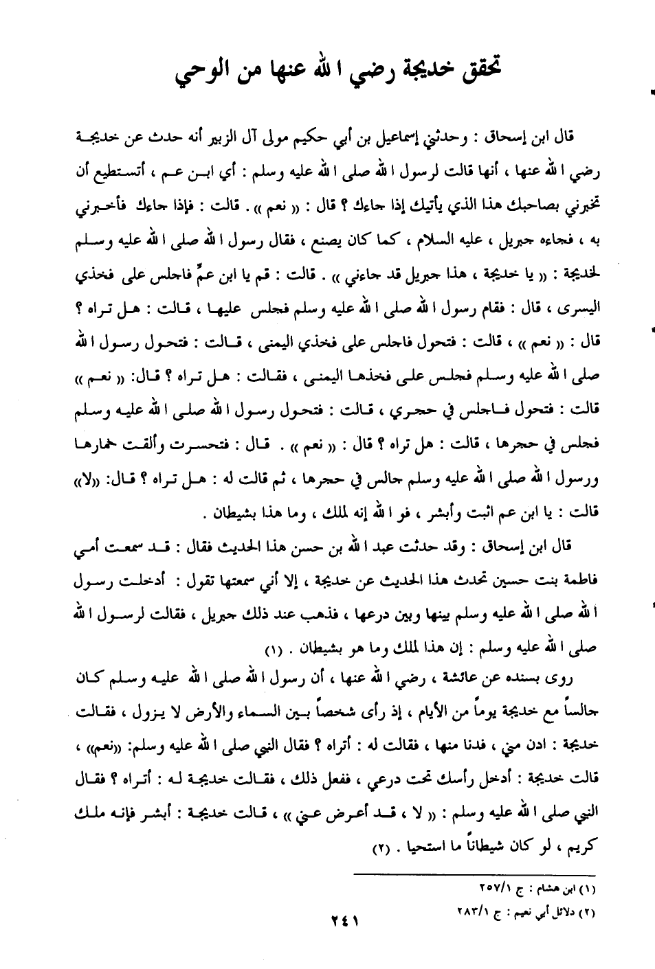 قال ابن إسحاق: وقد حدثت عبد الله بن حسن هذا الحديث فقال: قد سمعت أمي فاطمة بنت حسين تحدث هذا الحديث عن خديجة، إلا أني سمعتها تقول: أدخلت رسول الله - صلى الله عليه وسلم - بينها وبين درعها، فذهب عند ذلك جبريل، فقالت لرسول الله - صلى الله عليه وسلم -: إن هذا لملك وما هو بشيطان. (¬1)