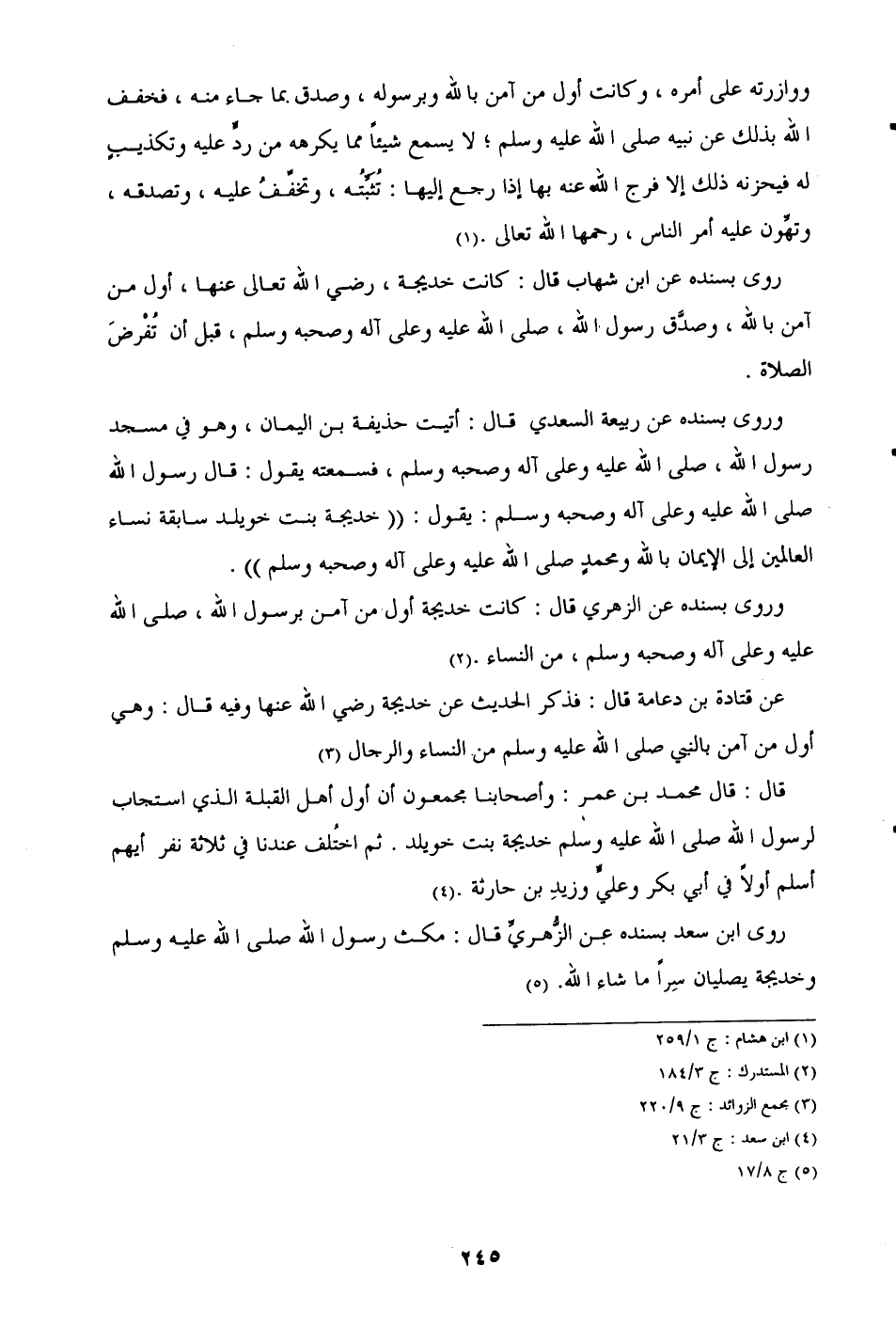 روى بسنده عن ابن شهاب قال: كانت خديجة، رضي الله تعالى عنها، أول من أمن بالله، وصدَّق رسول الله، صلى الله عليه وعلى آله وصحبه وسلم، قبل أن تُفْرضَ الصلاة.