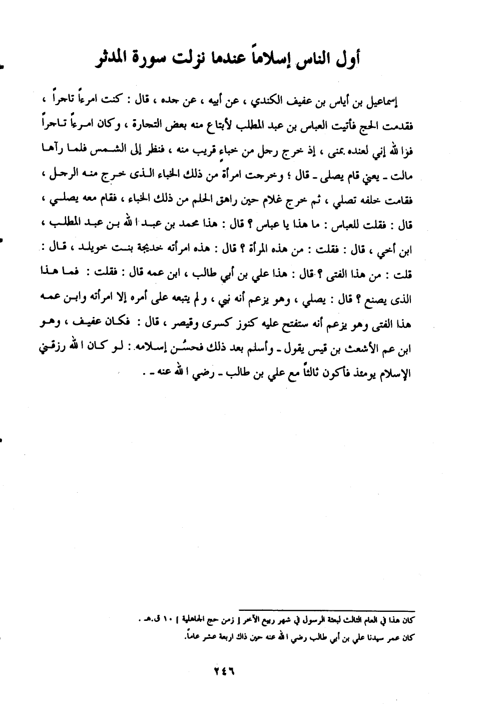 إسماعيل بن إياس بن عفيف الكندي، عن أنس، عن جده، قال: كنت امرءًا تاجرًا، فقدمت الحج فأتيت العباس بن عبد المطلب لأبتاع منه بعض التجارة، وكان امرءًا تاجرًا فوالله إني لعنده بمنى، إذ خرج رجل من خباءٍ قريب منه، فنظر إلى الشمس فلما رآها مالت -يعني قام يصلى- قال؛ وخرجت امرأة من ذلك الخباء الذي خرج منه الرجل، فقامت خلفه تصلي، ثم خرج غلام حين راهق الحلم من ذلك الخباء، فقام معه يصلي، قال: فقلت للعباس: ما هذا يا عباس؟ قال: هذا محمد بن عبد الله بن عبد المطلب، ابن أخي، قال: فقلت: من هذه المرأة؟ قال: هذه امرأته خديجة بنت خويلد، قال: قلت: من هذا الفتى؟. قال: هذا علي بن أبي طالب، ابن عمه قال: فقلت: فما هذا الذي يصنع؟ قال: يصلي، وهو يزعم أنه نبي ولم يتبعه على أمره إلا امرأته وابن عمه هذا الفتى وهو يزعم أنه ستفتح عليه كنوز كسرى وقيصر، قال: فكان عفيف، وهو ابن عم الأشعث بن قيس يقول- وأسلم بعد ذلك فحسُن إسلامه: لو كان الله رزقني الإِسلام يومئذ فأكون ثالثًا مع علي بن أبي طالب -رضي الله عنه-.