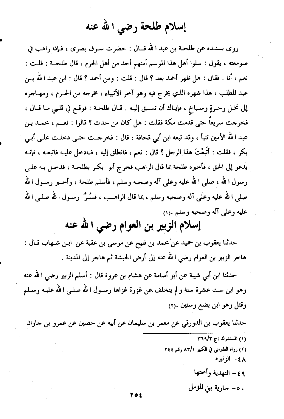 روى بسنده عن طلحة بن عبد الله قال: حضرت سوق بصرى، فإذا راهب في صومعته، يقول: سلوا أهل هذا المرسم أمنهم أحد من أهل الحرم، قال طلحة: قلت: نعم، أنا. فقال: هل ظهر أحمد بعد؟ قال: قلت: ومن أحمد؟ قال: ابن عبد الله بن عبد المطب، هذا شهره الذي يخرج فيه وهو آخر الأنبياء، مخرجه من الحرم، ومهاجره إلى نخل وحرةٍ وسباخٍ، فإياك أن تسبق إليه. قال طلحة: فوقع في قلبي ما قال، فخرجت سريعًا حتى قدمت مكة فقلت: هل كان من حدث؟ قالوا: نعم، محمد بن عبد الله الأمين تنبأ، وقد تبعه ابن أبي قحافة، قال: فخرجت حتى دخلت على أبي بكر، فقلت: أتَبِعْتَ هذا الرجل؟ قال: نعم، فانطلق إليه، فادخل عليه فاتبعه، فإنه يدعو إلى الحق، فأخبره طلحة بما قال الراهب فخرج أبو بكر بطلحة، فدخل به على رسول الله، صلى الله عليه وعلى آله وصحبه وسلم، فأسلم طلحة، وأخبر رسول الله صلى الله عليه وعلى آله وصحبه وسلم, بما قال الراهب، فسُرَّ رسول الله صلى الله عليه وعلى آله وصحبه وسلم. (¬1)