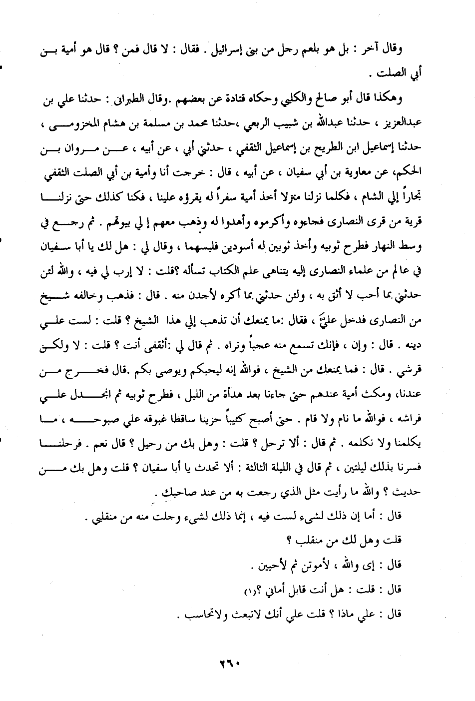 وهكذا قال أبو صالح والكلبي وحكاه قتادة عن بعضهم. وقال الطبراني: حدثنا علي بن عبد العزيز، حدثنا عبد الله بن شبيب الربعي، حدثنا محمد بن مسلمة بن هشام المخزومى، حدثنا إسماعيل ابن الطريح بن إسماعيل الثقفي، حدثني أبى، عن أبيه، عن مروان بن الحكم، عن معاوية بن أبي سفيان، عن أبيه، قال: خرجت أنا وأمية بن أبي الصلت الثقفي تجارًا إلى الشام، فكلما نزلنا منزلًا أخذ أمية سفرًا له يقرؤه علينا، فكنا كذلك حتى نزلنا قرية من قرى النصارى فجاءوه وأكرموه وأهدوا له وذهب معهم إلى بيوتهم. ثم رجع في وسط النهار فطرح ثوبيه وأخذ ثوبين له أسودين فلبسهما، وقال لي: هل لك يا أبا سفيان في عالم من علماء النصارى إليه يتناهى علم الكتاب تسأله؟ قلت: لا إرب لي فيه، والله لئن حدثني بما أحب لا أثق به، ولئن حدثني بما أكره لأجدن منه. قال: فذهب وخالفه شيخ من النصارى فدخل عليَّ، فقال: ما يمنعك أن تذهب إلى هذا الشيخ؟ قلت: لست على دينه. قال: وإن، فإنك تسمع منه عجبًا وتراه. ثم قال لي: أثقفى أنت؟ قلت: لا ولكن قرشي. قال: فما يمنعك من الشيخ، فوالله إنه ليحبكم ويوصي بكم. قال فخرج من عندنا، ومكث أمية عندهم حتى جاءنا بعد هدأة من الليل، فطرح ثوبيه ثم انجدل على فراشه، فوالله ما نام ولا قام. حتى أصبح كئيبًا حزينا ساقطًا غبوقه على صبوحه، ما يكلمنا ولا نكلمه. ثم قال: ألا ترحل؟ قلت: وهل بك من رحيل؟ قال نعم. فرحلنا فسرنا بذلك ليلتين، ثم قال في الليلة الثالثة: ألا تحدث يا أبا سفيان؟ قلت وهل بك من حديث؟ والله ما رأيت مثل الذي رجعت به من عند صاحبك.