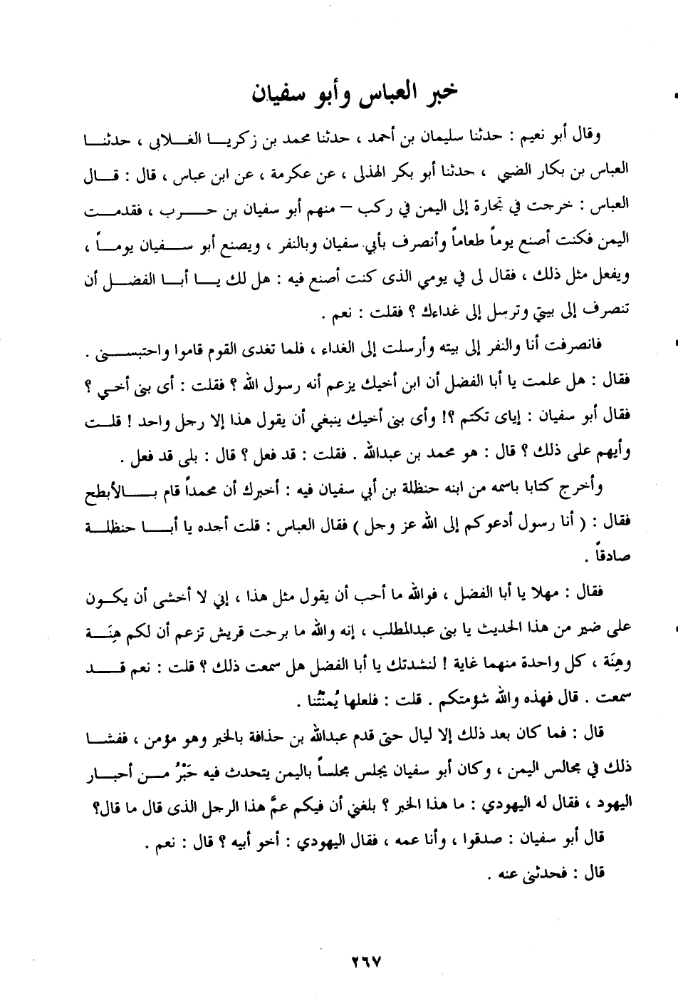 وأخرج كتابًا باسمه من ابنه حنظلة بن أبي سفيان فيه: أخبرك أن محمدًا قام بالأبطح فقال: (أنا رسول أدعوكم إلى الله -عَزَّ وجَلَّ-) فقال العباس: قلت أجده يا أبا حنظلة صادقًا.