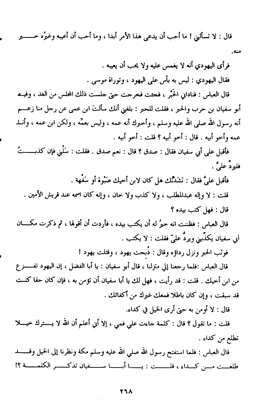قال العباس: فناداني الحَبْر، فجئت فخرجت حتى جلست ذلك المجلس من الغد، وفيه أبو سفيان بن حرب والحبر، فقلت للحبر: بلغني أنك سألتَ ابن عمى عن رجل منا زعم أنه رسول الله - صلى الله عليه وسلم -، وأخبرك أنه عمه، وليس بعمِّه، ولكن ابن عمه، وأنا عمه وأخو أبيه. قال أخو أبيه؟ قلت: أخو أبيه.