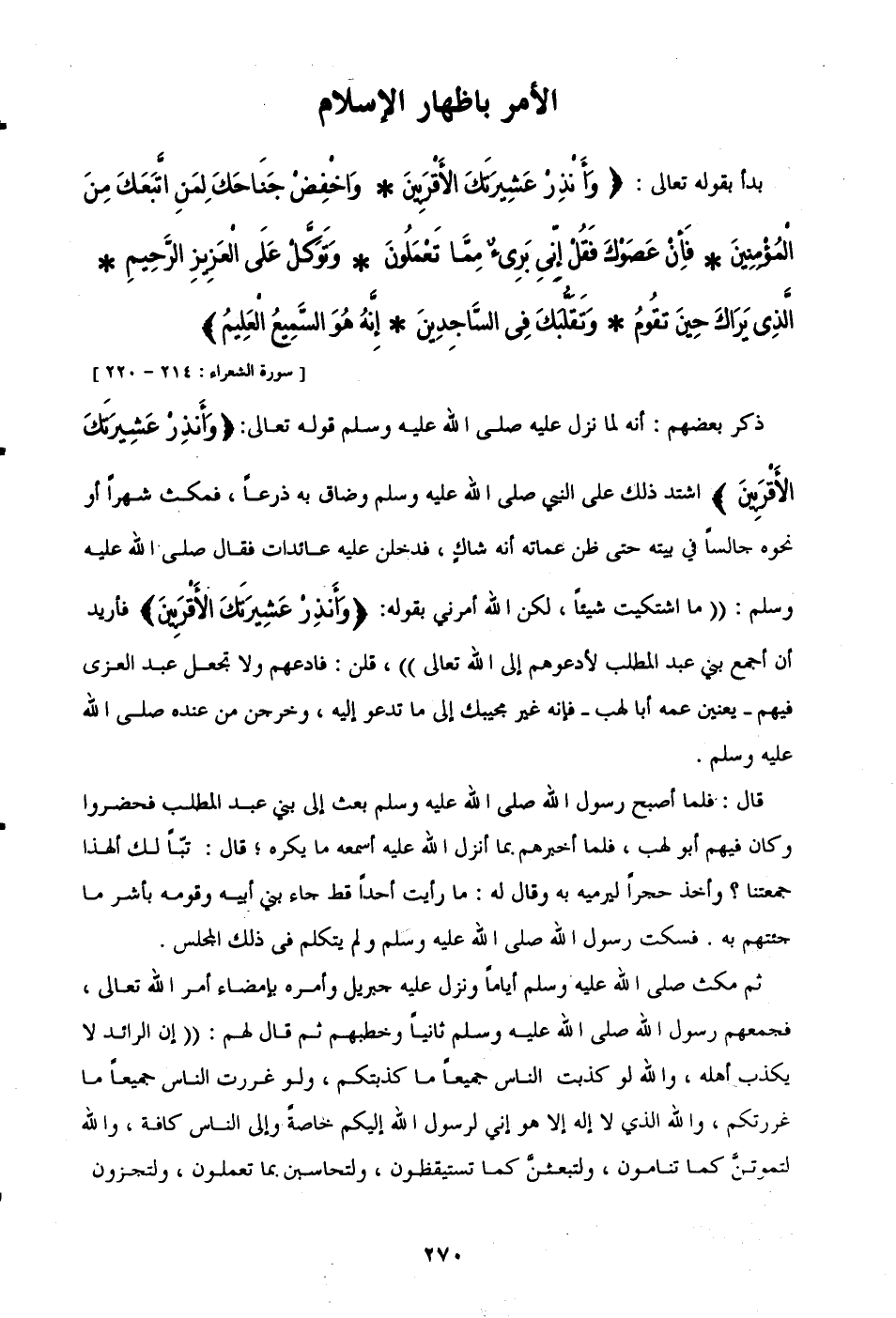 بدأ بقوله تعالى: {وَأَنْذِرْ عَشِيرَتَكَ الْأَقْرَبِينَ * وَاخْفِضْ جَنَاحَكَ لِمَنِ اتَّبَعَكَ مِنَ الْمُؤْمِنِينَ * فَإِنْ عَصَوْكَ فَقُلْ إِنِّي بَرِيءٌ مِمَّا تَعْمَلُونَ * وَتَوَكَّلْ عَلَى الْعَزِيزِ الرَّحِيمِ* الَّذِي يَرَاكَ حِينَ تَقُومُ * وَتَقَلُّبَكَ فِي السَّاجِدِينَ * إِنَّهُ هُوَ السَّمِيعُ الْعَلِيمُ} [سورة الشعراء: 214 - 220]