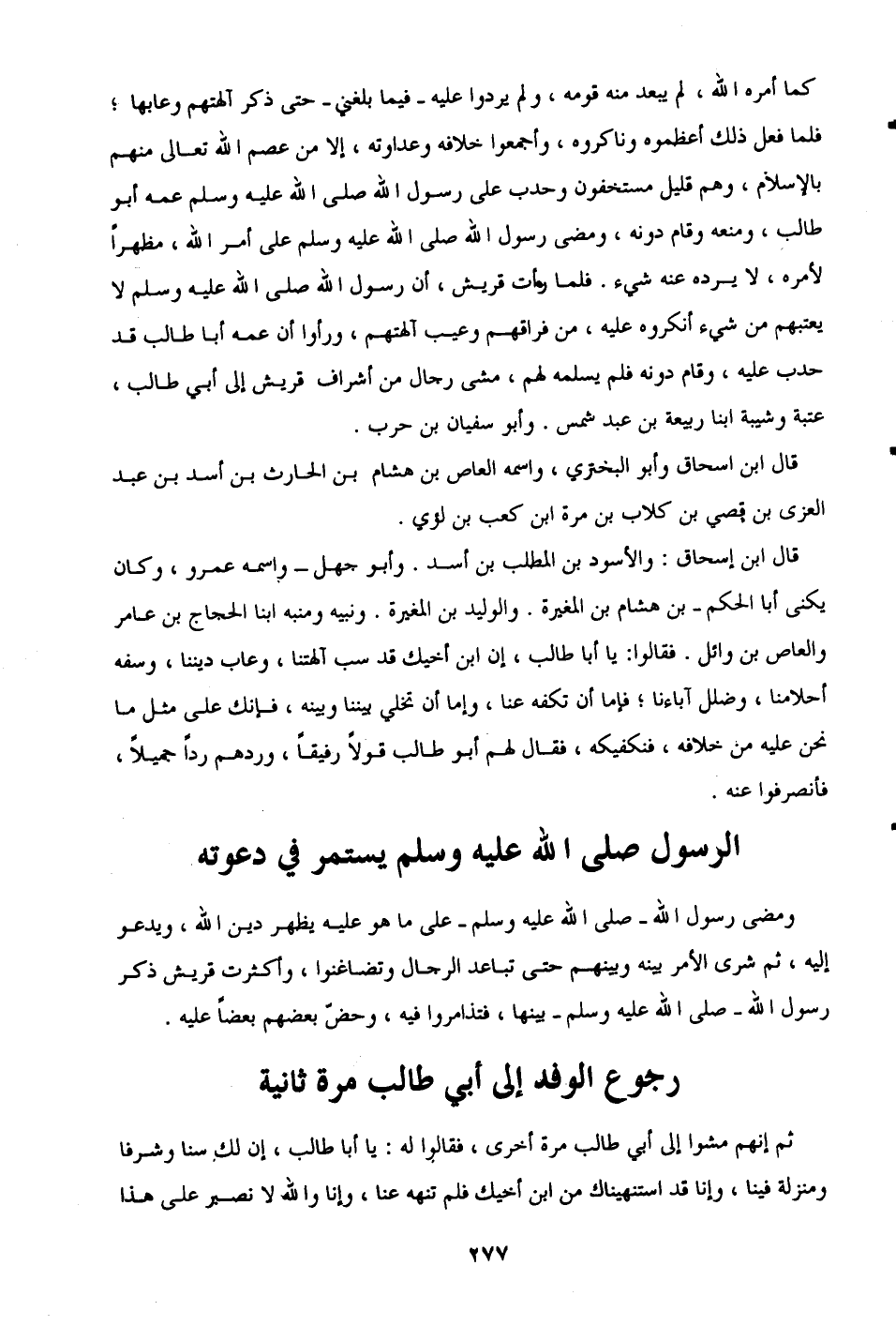 قال ابن إسحاق: والأسود بن المطلب بن أسد. وأبو جهل -واسمه عمرو، وكان يكنى أبا الحكم- بن هشام بن المغيرة. والوليد بن المغيرة. ونبيه ومنبه ابنا الحجاج بن عامر والعاص بن وائل. فقالوا: يا أبا طالب، إن ابن أخيك قد سب آلهتنا، وعاب ديننا، وسفه أحلامنا، وضلل آباءنا؛ فإما أن تكفه عنا، وإما أن تخلي بيننا وبينه، فإنك على مثل ما نحن عليه من خلافه، فنكفيكه، فقال لهم أبو طالب قولًا رفيقًا، وردهم ردًا جميلًا، فانصرفوا عنه.