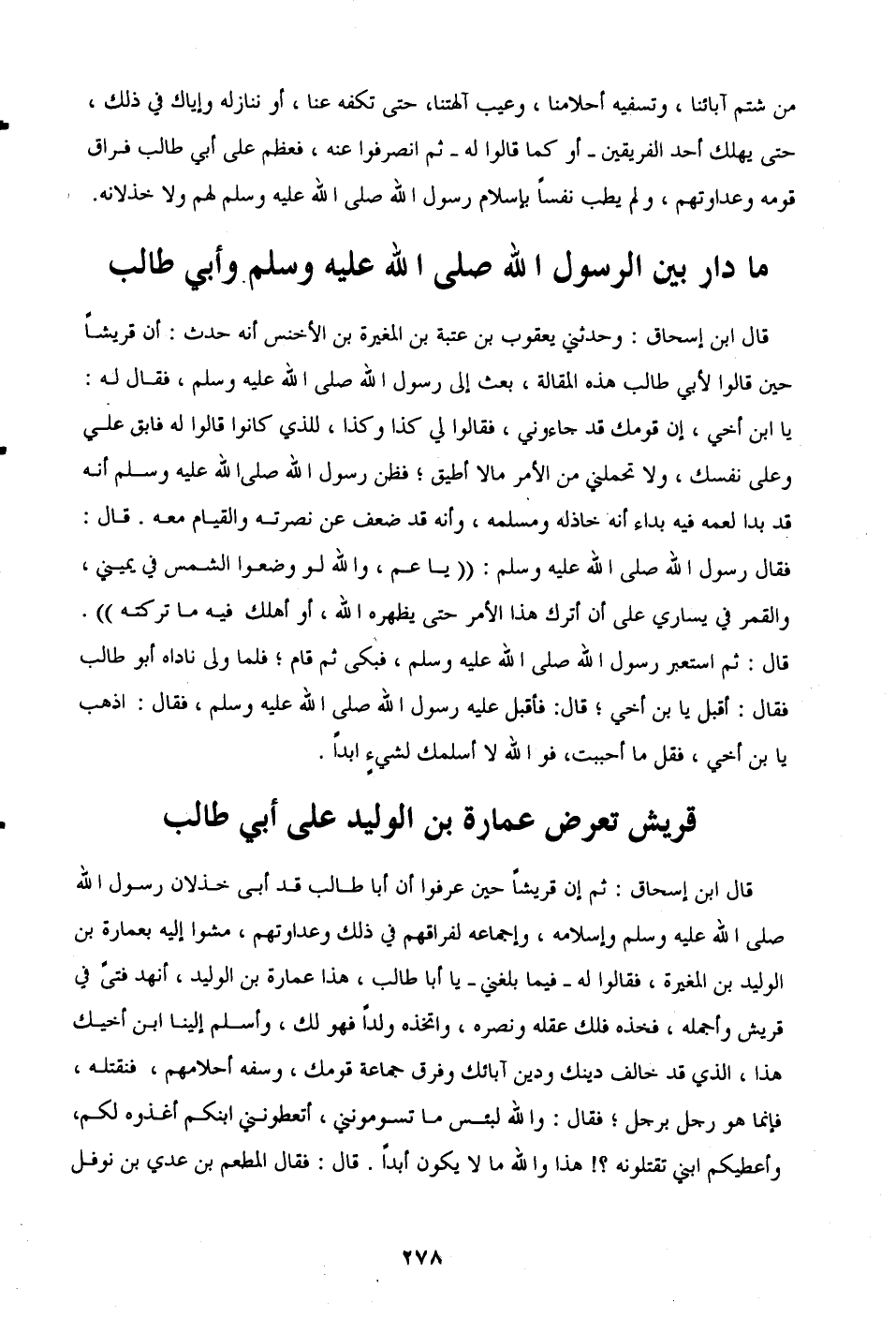 قال ابن إسحاق: ثم إن قريشًا حين عرفوا أن أبا طالب قد أبى خذلان رسول الله - صلى الله عليه وسلم - وإسلامه، وإجماعه لفراقهم في ذلك وعداوتهم، مشوا إليه بعمارة بن الوليد بن المغيرة، فقالوا له -فيما بلغني- يا أبا طالب، هذا عمارة بن الوليد، أنهد فتىً في قريش وأجمله، فخذه فلك عقله ونصره، واتخذه ولداً فهو لك، وأسلم إلينا ابن أخيك هذا، الذي قد خالف دينك ودين آبائك وفرق جماعة قومك، وسفه أحلامهم، فنقتله، فإنما هو رجل برجل؛ فقال: والله لبئس ما تسومونني، أتعطونني ابنكم أغذوه لكم، وأعطيكم ابني تقتلونه؟! هذا والله ما لا يكون أبدًا. قال: فقال المطعم بن عدي بن نوفل