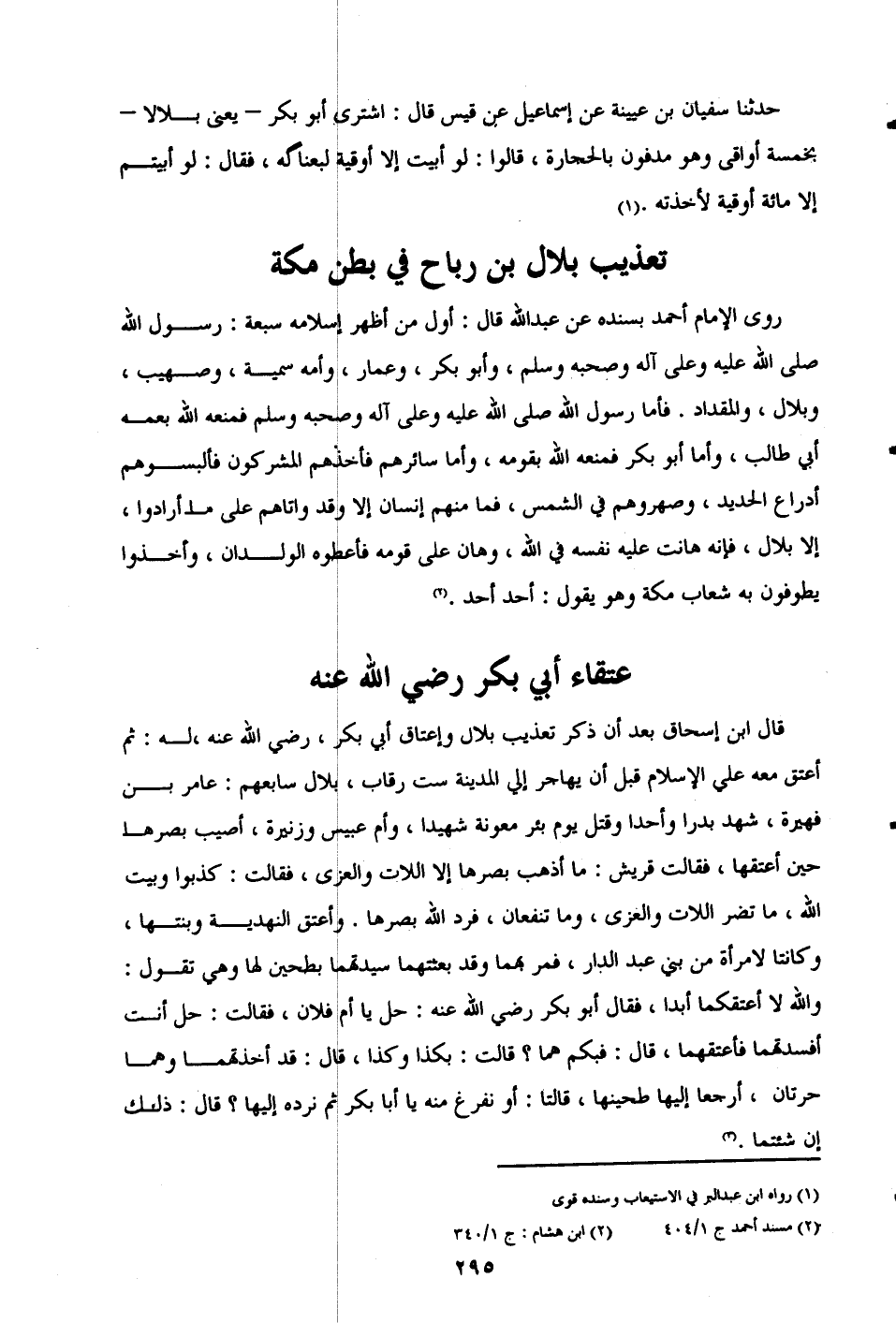 حدثنا سفيان بن عيينة عن إسماعيل عن قيس قال: اشترى أبو بكر -يعني بلالا- بخمسة أواقي وهو مدفون بالحجارة، قالوا: لو أبيت إلا أوقية لبعنا له، فقال: لو أبيتم إلا مائة أوقية لأخذته. (¬1)