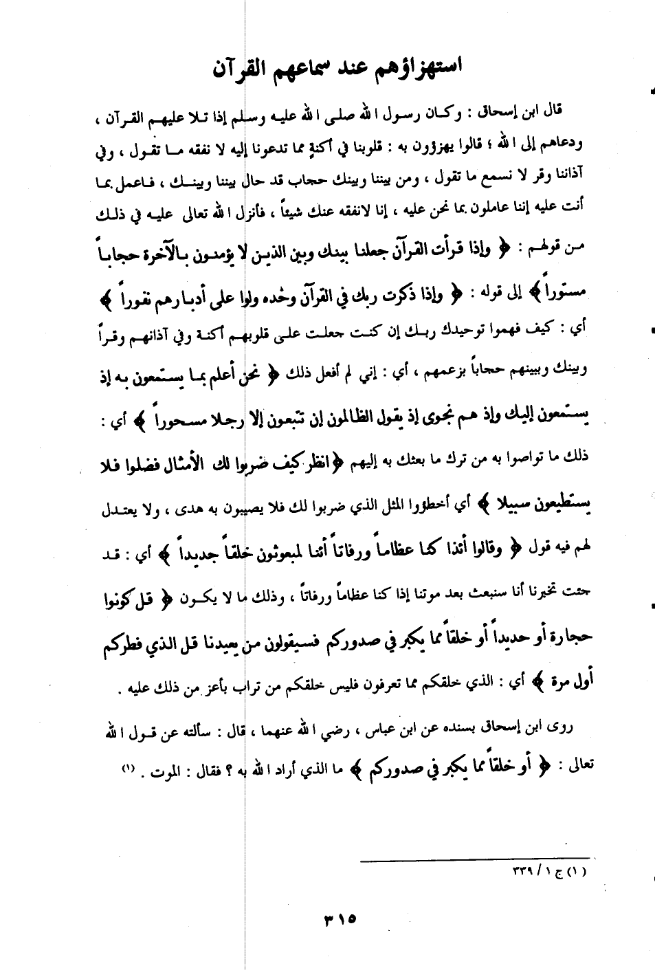 قال ابن إسحاق: وكان رسول الله - صلى الله عليه وسلم - إذا تلا عليهم القرآن، ودعاهم إلى الله؛ قالوا يهزؤون به: قلوبنا في أكنةٍ مما تدعونا إليه لا نفقه ما تقول، وفي آذاننا وقر لا نسمع ما تقول، ومن بيننا وبينك حجاب قد حال بيننا وبينك، فاعمل بما أنت عليه إننا عاملون بما نحن عليه، إنا لا نفقه عنك شيئًا، فأنزل الله تعالى عليه في ذلك من قولهم: {وَإِذَا قَرَأْتَ الْقُرْآنَ جَعَلْنَا بَيْنَكَ وَبَيْنَ الَّذِينَ لَا يُؤْمِنُونَ بِالْآخِرَةِ حِجَابًا مَسْتُورًا} إلى قومه: {وَإِذَا ذَكَرْتَ رَبَّكَ فِي الْقُرْآنِ وَحْدَهُ وَلَّوْا عَلَى أَدْبَارِهِمْ نُفُورًا} أي: كيف فهموا توحيدك ربك إن كنت جعلت على قلوبهم أكنة وفي آذانهم وقرًا وبينك وبينهم حجابًا بزعمهم، أي: إنى لم أفعل ذلك {نَحْنُ أَعْلَمُ بِمَا يَسْتَمِعُونَ بِهِ إِذْ يَسْتَمِعُونَ إِلَيْكَ وَإِذْ هُمْ نَجْوَى إِذْ يَقُولُ الظَّالِمُونَ إِنْ تَتَّبِعُونَ إِلَّا رَجُلًا مَسْحُورًا} أي: ذلك ما تواصوا به من ترك ما بعثك به إليهم {انْظُرْ كَيْفَ ضَرَبُوا لَكَ الْأَمْثَالَ فَضَلُّوا فَلَا يَسْتَطِيعُونَ سَبِيلًا} أي أخطئوا المثل الذي ضربوا لك فلا يصيبون به هدى، ولا يعتدل لهم فيه قول {وَقَالُوا أَإِذَا كُنَّا عِظَامًا وَرُفَاتًا أَإِنَّا لَمَبْعُوثُونَ خَلْقًا جَدِيدًا} أي: قد جئت تخبرنا أنا سنبعث بعد موتنا إذا كنا عظامًا ورفاتًا، وذلك ما لا يكون {قُلْ كُونُوا حِجَارَةً أَوْ حَدِيدًا (50) أَوْ خَلْقًا مِمَّا يَكْبُرُ فِي صُدُورِكُمْ فَسَيَقُولُونَ مَنْ يُعِيدُنَا قُلِ الَّذِي فَطَرَكُمْ أَوَّلَ مَرَّةٍ} أي: الذي خلقكم مما تعرفون فليس خلقكم من تراب بأعز من ذلك عليه.