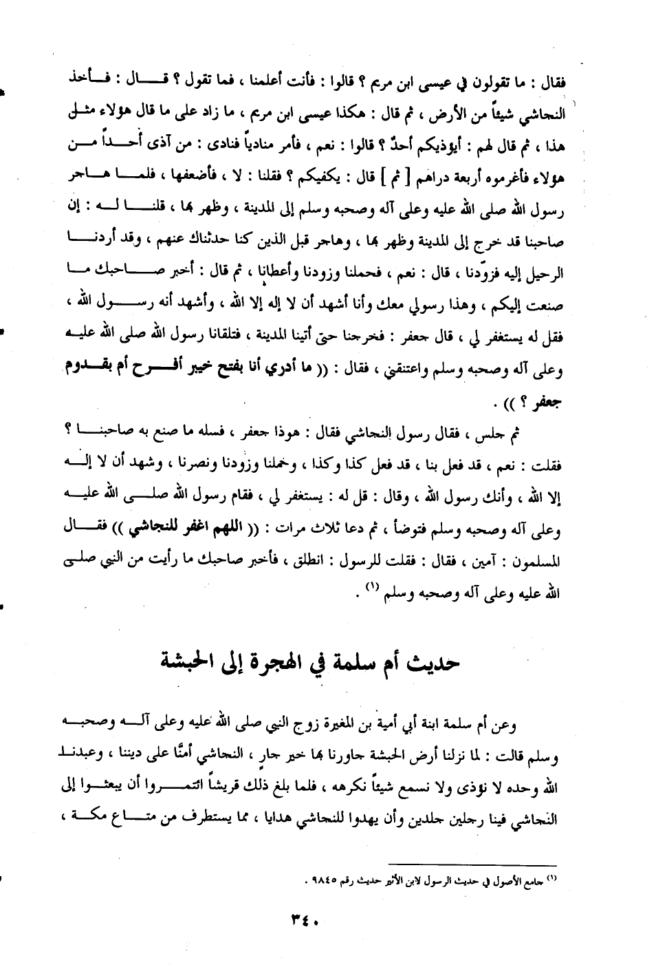 وعن أم سلمة ابنة أبي أمية بن المغيرة زوج النبي صلى الله عليه وعلى آله وصحبه وسلم قالت: لما نزلنا أرض الحبشة جاورنا بها خير جارٍ، النجاشي أمنَّا على ديننا، وعبدنا الله وحده لا نؤذى ولا نسمع شيئًا نكرهه، فلما بلغ ذلك قريشًا ائتمروا أن يبعثوا إلى النجاشي فينا رجلين جلدين وأن يهدوا للنجاشي هدايا، مما يستطرف من متاع مكة،