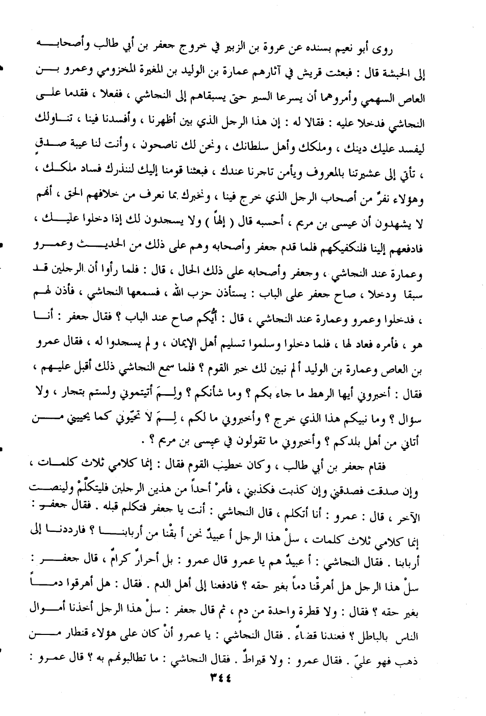 روى أبو نعيم بسنده عن عروة بن الزبير في خروج جعفر بن أبي طالب وأصحابه إلى الحبشة قال: فبعثت قريش في آثارهم عمارة بن الوليد بن المغيرة المخزومي وعمرو بن العاص السهمي وأمروهما أن يسرعا السير حتى يسبقاهم إلى النجاشي، ففعلا، فقدما على النجاشي فدخلا عليه: فقالا له: إن هذا الرجل الذي بين أظهرنا، وأفسدنا فينا، تناولك ليفسد عليك دينك، وملكك وأهل سلطانك، ونحن لك ناصحون، وأنت لنا عيبة صدقٍ، تأتي إلى عشيرتنا بالمعروف ويأمن تاجرنا عندك، فبعثنا قومنا إليك لننذرك فساد ملكك، وهؤلاء نفرٌ من أصحاب الرجل الذي خرج فينا، ونخبرك بما نعرف من خلافهم الحق، أنهم لا يشهدون أن عيسى بن مريم، أحسبه قال (إلهًا) ولا يسجدون لك إذا دخلوا عليك، فادفعهم إلينا فلنكفيكهم فلما قدم جعفر وأصحابه وهم على ذلك من الحديث وعمرو وعمارة عند النجاشي، وجعفر وأصحابه على ذلك الحال، قال: فلما رأوا أن الرجلين قد سبقا ودخلا، صاح جعفر على الباب: يستأذن حزب الله، فسمعها النجاشي، فأذن لهم، فدخلوا وعمرو وعمارة عند النجاشي، قال: أيُّكم صاح عند الباب؟ فقال جعفر: أنا هو، فأمره فعاد لها، فلما دخلوا وسلموا تسليم أهل الإيمان، ولم يسجدوا له، فقال عمرو بن العاص وعمارة بن الوليد ألم نبين لك خبر القوم؟ فلما سمع النجاشي ذلك أقبل عليهم، فقال: أخبروني أيها الرهط ما جاء بكم؟ وما شأنكم؟ ولِمَ أتيتموني ولستم بتجار، ولا سؤال؟ وما نبيكم هذا الذي خرج؟ وأخبروني مالكم، لِمَ لا تحيّوني كما يحييني من أتاني من أهل بلدكم؟ وأخبروني ما تقولون في عيسى بن مريم؟.